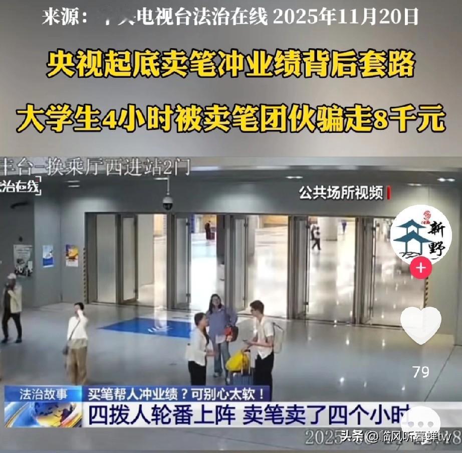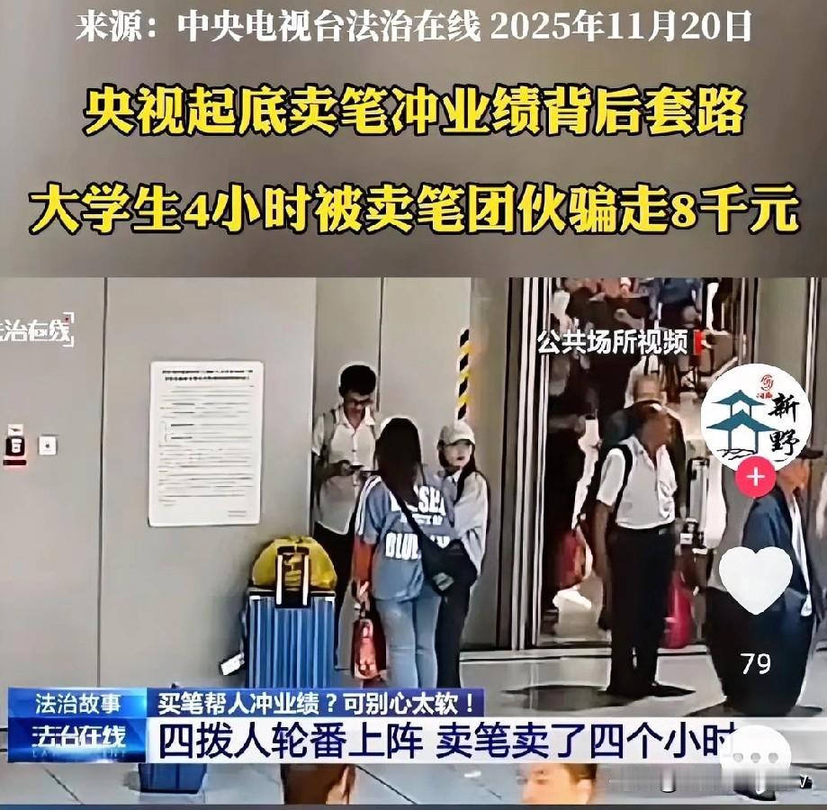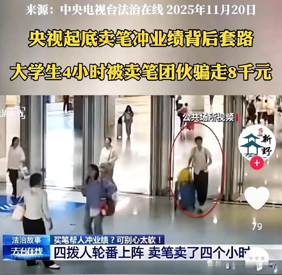 大学毕业生“4小时被8人轮番拿捏,被骗8000多”?第一次被骗了,是善良、同情心泛滥,情有可原,但第二,三,四次被骗就有点不理解了! 刚毕业的小张在北京丰台站转乘去实习,好心帮“大学生”冲业绩买笔,4小时被8人轮番拿捏,被骗8000多还被诱导网贷,手里只多了几支成本几十块的笔!央视新闻已核实该事件全貌,警方同步通报了办案进展 。 两名穿学生装的女孩拦住他,哭着说“业绩进不了前十就被开除”,198元一支的“德国进口笔”贵有贵的道理。小张共情实习不易,花520元买了两支,转头就被第二拨女孩以“老乡”相称,又掏198元买了一支。 第三拨先上来一个男生被拒,自称“组长”的女子立刻哭诉“半夜偷着哭,担心弟弟工作”,见小张不买就说“一天没吃饭喝水”借钱,承诺当晚归还。小张心软转了2000元,又被对方以“帮要回之前被骗的3000元”为由,拿他手机贷了3000元转走,这一细节被北京公交警方证实 。 第四拨两名壮汉把小张拉到角落,态度强硬逼他向家人借钱。“跟父母要1000元不够,跟双胞胎哥哥要300元还不行,再整500元”,小张孤身在外心生畏惧,又转了2000多元,4小时累计被骗8000多元。 警方抓获8名嫌疑人后揭开内幕,他们根本不是大学生,穿学生装只是伪装。笔分39.8元一盒、198元一支、1980元一支三档,1980元的高端笔成本才60多元,全靠“见人下菜碟”忽悠,专业机构已做价格认定 。 武汉动漫展上,卖笔人员被拒后扬言“有80号人,砍死你”;成都烧烤摊顾客拒绝后,被对方砸垃圾桶泄愤,两地事件均有监控视频及媒体报道佐证 。部分案件还会发展成“杀猪盘”,嫌疑人用暧昧话术拉近距离,实施更大金额诈骗,警方已提醒警惕这类升级套路 。 你在火车站、商圈遇到过这种主动搭讪卖笔的吗?面对苦情戏和强硬纠缠,你会怎么应对?