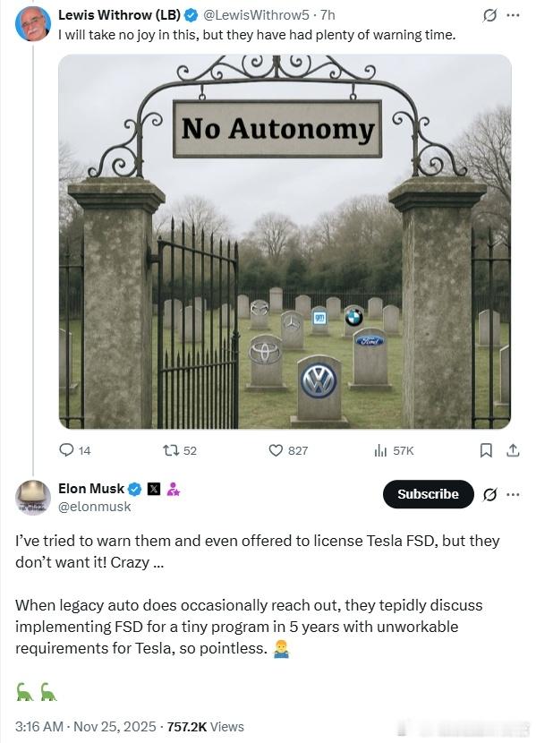 分析师说FSD会让传统车企面临行业危机,马斯克吐槽说:当年我主动递出橄榄枝,甚至授权 FSD,传统车企却 “摆烂” 拒绝