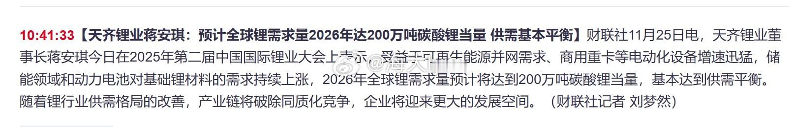 天齐锂业董事长蒋安琪今日在2025年第二届中国国际锂业大会上表示,受益于可再生能源并网需求、商用重卡等电动化设备增速迅猛,储能领域和动力电池对基础锂材料的需求持续上涨,2026年全球锂需求量预计将达到200万吨碳酸锂当量,基本达到供需平衡。随着锂行业供需格局的改善,产业链将破除同质化竞争,企业将迎来更大的发展空间。