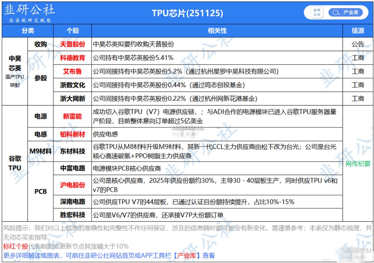 简单说下这两天的行情,就是英伟达GPU→谷歌TPU(从通用到专用),GPU兼顾训练、推理、多模态、推荐等所有场景,而TPU为AI推理服务。这也说明Ai从训练时代到推理时代,已经到来。 现在谷歌和英伟达的走势也证实了这一过程。谷歌替代英伟达趋势已经形成。 然后有两个催化: 1、Meta正考虑斥资数十亿美元购买谷歌的TPU。 2、谷歌正在推出其最强大的AI芯片Ironwood(大约是英伟达B200水平),未来几周将全面上市。 所以今天爆发了谷歌链的硬件。相关产业链核心: ①腾景科技:谷歌 OCS 交换机的“核心光学元件”唯一量产供应商,相关收入已占公司营收 28%,每部署 4 096 颗 TPU 就要配套一套 OCS。(今天的光库、德科立,更像是腾景的补涨) ②特发信息:谷歌数据中心高速光模块中的MPO(多光纤连接器)供应商之一,在谷歌最新一代TPU(Ironwood)的配套光网络建设中占据约10%的份额。 ③长飞光纤:老朋友了,核心地位不多介绍,受益是因为空心光纤和谷歌osc光交换是天然搭配,不需要光电转换,可以说是除了OCS 交换机的第二核心受益。 另外还有国产TPU。国内真正做出TPU并投入商业使用的只有中昊芯英一家,其首款芯片“刹那”2023年底完成流片并规模出货,天普股份被收购、科德教育参股。这个确实挖掘晚了一步,承认。