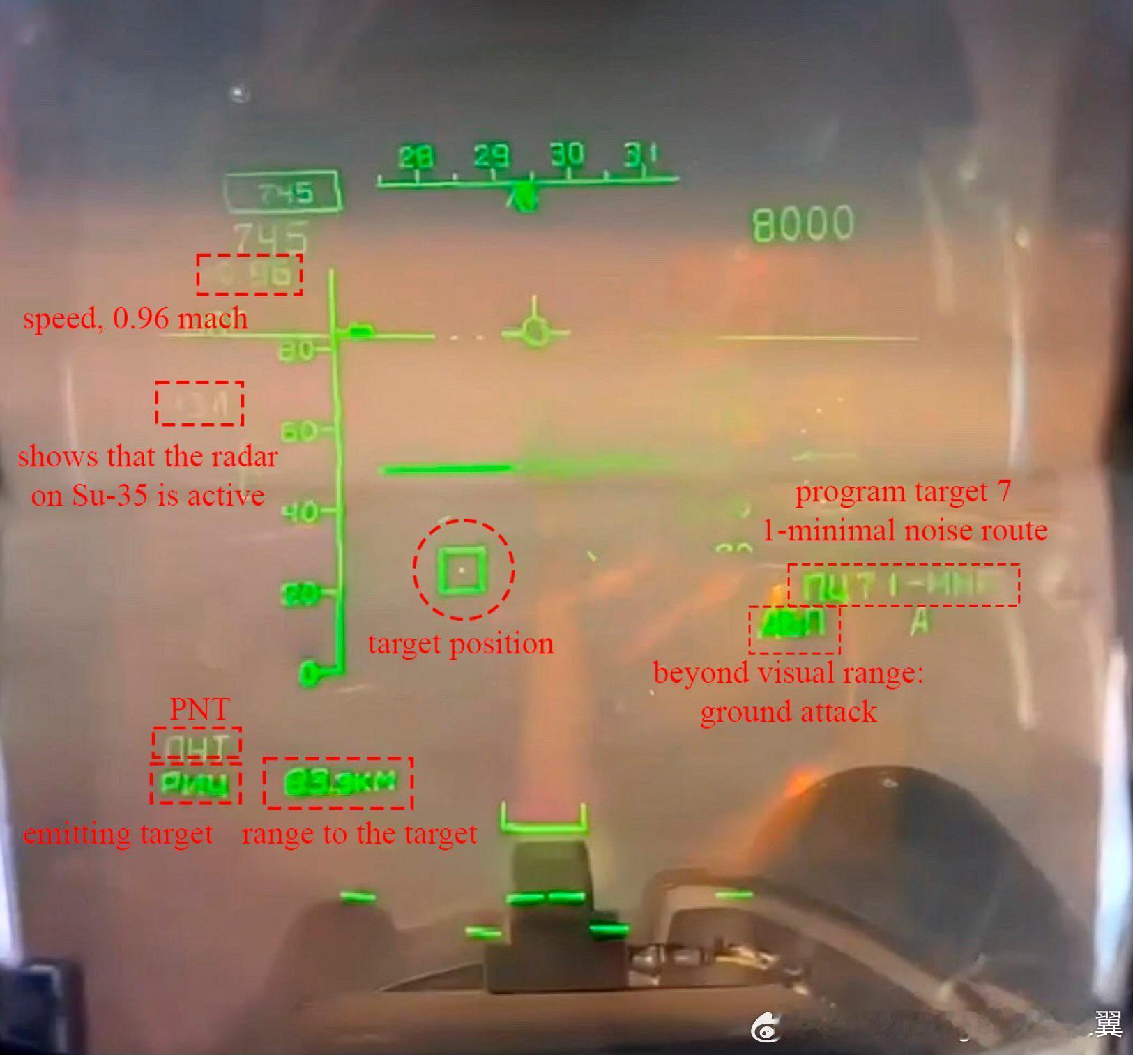 俄乌战争中,苏-35S使用Kh-31PM反辐射导弹攻击地空导弹雷达时的HUD视图。 Kh-31PM是Kh-31P的现代化升级版本,具备更远的射程和更先进的导引头技术。 该弹专门设计用于锁定并摧毁敌方的雷达发射源,包括地对空导弹系统的雷达(如“爱国者”系统雷达)、预警雷达及其他地面或海上雷达目标。采用独特的两级推进系统。发射后,首先使用固体燃料火箭助推器加速至超音速,随后助推器脱离,弹体内部转换为冲压喷气发动机的燃烧室,使用液体燃料持续高速飞行。 凭借冲压喷气发动机,其最大飞行速度可达约3.5马赫(约合4300公里/小时或1000米/秒),极大地缩短了反应时间,提高了突防能力。相较于标准型Kh-31P约110公里的射程,Kh-31PM的射程显著增加,高空发射时可达约240至260公里。Kh-31PM最大的改进之一是采用了新型的L-130多频段宽带被动雷达导引头,取代了早期型号需要针对不同雷达频段更换导引头的设计。这使得一枚导弹就能对抗几乎所有类型的防空系统雷达,并增强了抗干扰能力。