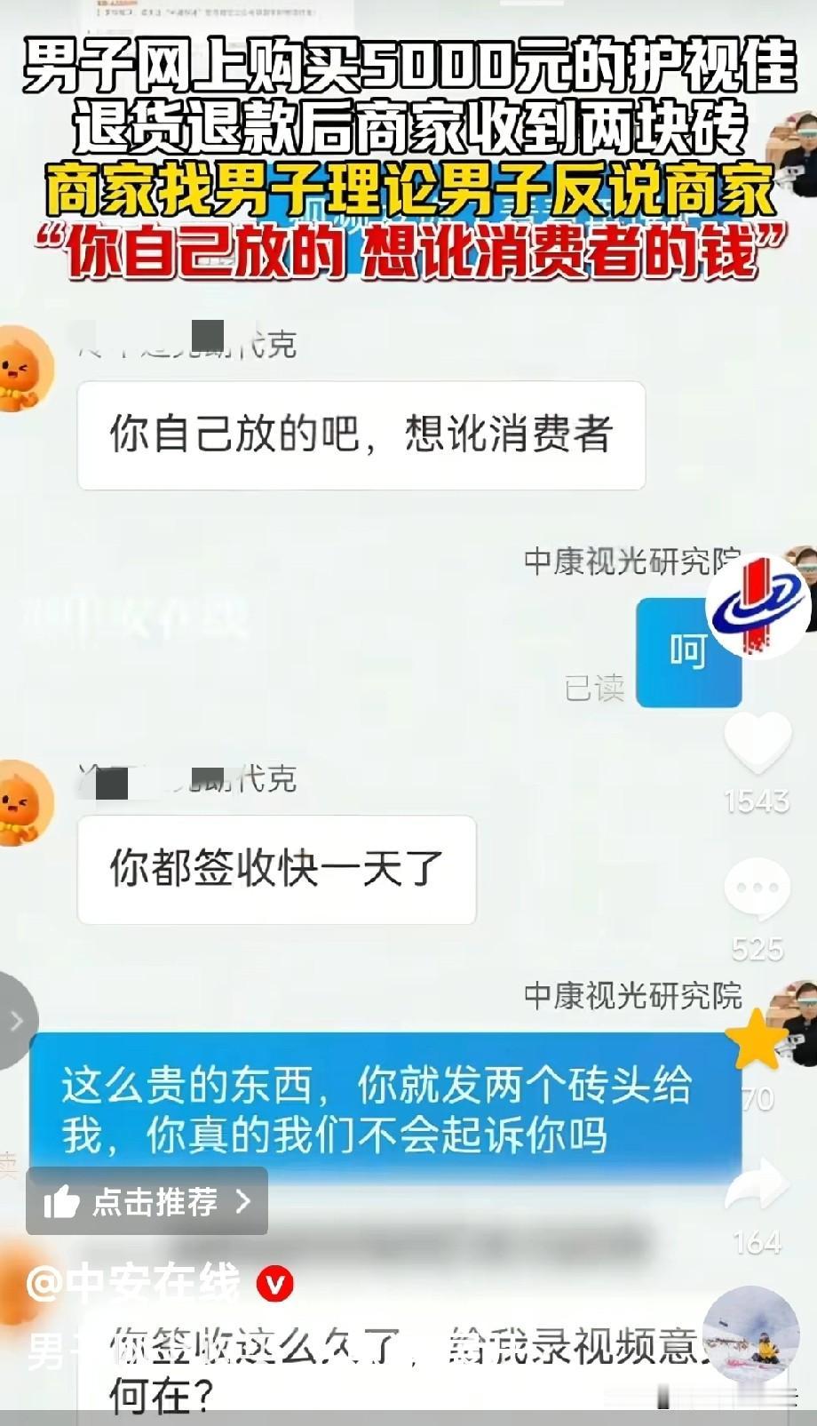离谱,白嫖的都这么大胆了吗? 一个商家发视频说,有个买家退货,他开箱时发现,本该退回的两台价值5000块的护视佳,变成了两块砖头。 商家说,多亏自己留了一手,开箱时录了视频,不然真的有理都说不清了。可是即使这样,在商家找到买家时,买家却一口咬定不知情,是商家为了讹诈消费者故意这样做的,他的意思是商家自己放的砖头。 商家很无语,说我们是厂家直发,有记录的,你看你的胶带和我们的都不一样。买家还是不承认,他说既然已经签收了,就不应该找他,还故意录视频。 有人说,为了防止买家退货调包,拿到快递的时候不是可以先看看重量对吗?可是这个买家也想到了这一点,两台产品的重量是5公斤,他寄的两块砖头加一个包装盒,也正好是5公斤。从重量上根本看不出来。所以商家怀疑这个买家是老手了。 商家说,他们两台护视佳都价值5000了,买家的行为涉嫌违法了。他已经报警了。 谁真谁假,相信大家都已经心知肚明了。其实要想查清楚也不难,我相信各个环节都会有监控的,如果还不出来认错,到时候可就不是原价赔偿这么简单了。 对于这件事,你有什么看法呢?