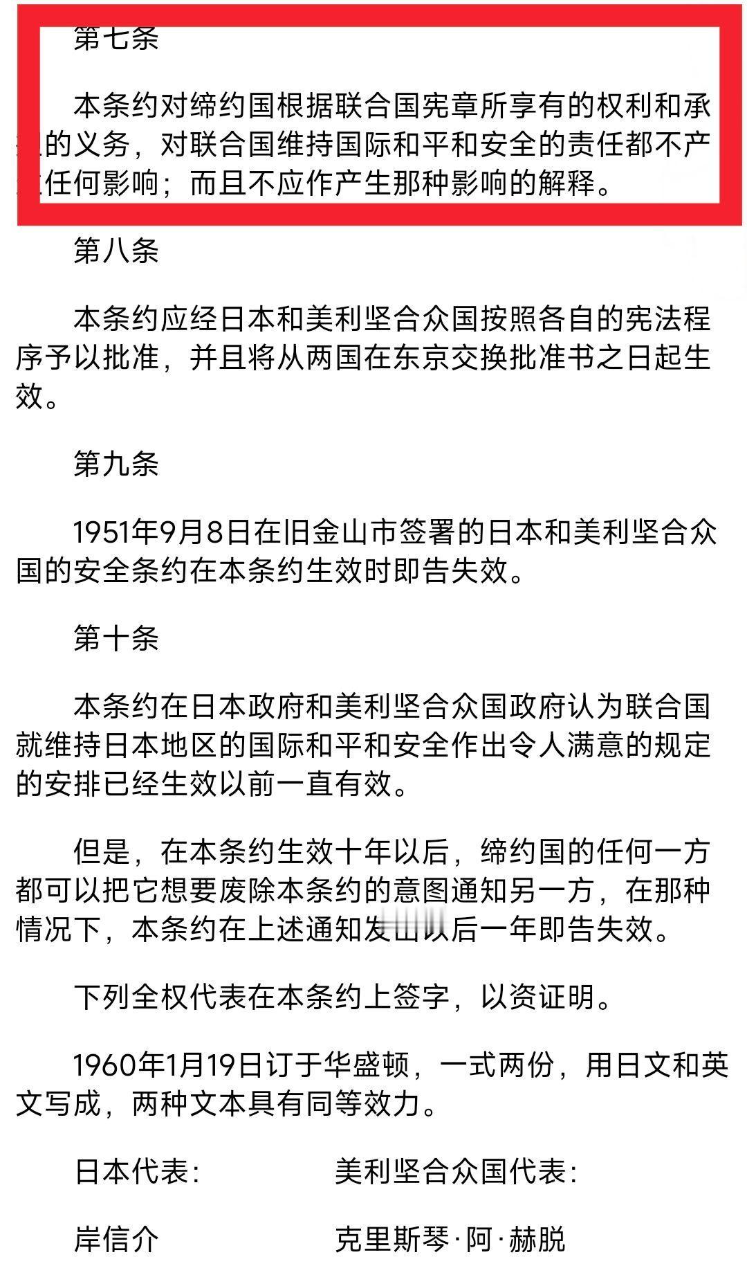 “敌国条款”已失效?《美日安保条约》早为中国攻日留好后门 所谓的“敌国条款”,指的是《联合国宪章》第53条和第107条。这两条规定二战的战胜国如果发现当年的轴心国(也就是日本、德国这些)有再次发动侵略的苗头,根本不需要经过安理会授权,直接就能动手,而且是合法的军事打击。 这对日本来说,简直就是一把悬在头顶的达摩克利斯之剑。所以这么多年来,日本做梦都想把这就几行字给删了。 他们最拿得出手的理由,就是1995年联大通过的一个决议,那个决议确实提到了建议删去“过时”的敌国条款。于是,这就成了日本外务省现在的救命稻草,到处嚷嚷“早就失效了”。 但事实真是这样吗?这就是典型的偷换概念。1995年那是“建议”,而且在那份决议通过的时候,中国和俄罗斯可是留了后手的。 当时中俄的态度很明确:这条款是二战胜利的法律基石,只要安理会五常没有一致点头,这法律效力就一天都在。 三十年过去了,你看五常谁松口了?只要中俄手里握着否决权,这条款就跟焊死在联合国宪章里一样,纹丝不动。 日本急着造谣“失效”,恰恰是因为他们心里虚。特别是最近日本右翼政客上蹿下跳,一会儿喊着“台湾有事就是日本有事”,一会儿又要修宪扩军,这不就是往“再次侵略”的枪口上撞吗? 他们怕的就是中国真的哪天不想跟他们废话了,直接把联合国宪章往桌上一拍,援引“敌国条款”采取行动,到时候日本连哭都没地方哭。 这时候肯定有人会说:“怕什么,日本有美国爸爸呢,《美日安保条约》不是摆设。” 其实很多人根本没仔细读过《美日安保条约》的原文。美国人精明着呢,早在1960年修订条约的时候,就在第7条里埋下了一颗雷。 第7条是这么写的:本条约不影响缔约国根据《联合国宪章》所享有的权利和义务,也不影响联合国维持国际和平与安全的责任。 这话说得文绉绉的,咱们翻译成大白话就是:如果这原本的条约跟联合国的规矩冲突了,那得听联合国的。 这逻辑是不是一下子就通了?如果中国是依据《联合国宪章》里的“敌国条款”对日本动手,那是在执行联合国的意志,是在维护世界和平。 这时候美国要是跳出来帮日本,那就是在公然对抗联合国宪章,违反国际法。更要命的是,根据安保条约第7条,美国自己都承认了不能违背联合国宪章。 也就是说,一旦这种局面出现,美国完全可以两手一摊,一脸无辜地对日本说:“兄弟,不是我不帮你,是条约里写了,我得先遵守联合国的法,爱莫能助啊。” 这就是美国人的鸡贼之处,他们早就防着日本这一手,绝不会为了日本去跟整个战后国际秩序硬碰硬。所谓的保护伞,在法理层面早就漏成了筛子。 现在的局面就很搞笑了。日本右翼在那儿自我催眠,以为有了美国就能无法无天;日本外务省在那儿掩耳盗铃,拼命想抹掉“敌国条款”的存在感。 而美国揣着明白装糊涂,只要日本不真的惹出天大的乱子,他就乐得在那儿收保护费。 这世界上的条约和法律,从来都是给守规矩的人看的,对于那些总想着钻空子、搞破坏的人来说,每一个字都可能是最后的审判。 日本外务省与其在网上打嘴仗,不如回去好好翻翻书,看看当年的字据到底是怎么签的。 你们觉得如果真的到了那一刻,美国是会为了日本撕毁联合国宪章,还是会果断选择“卖队友”来保全自己?欢迎到评论区讨论。