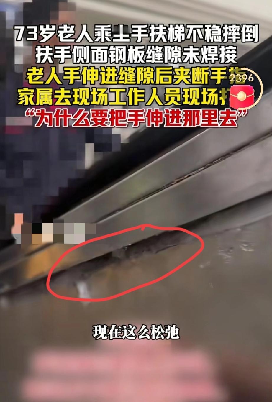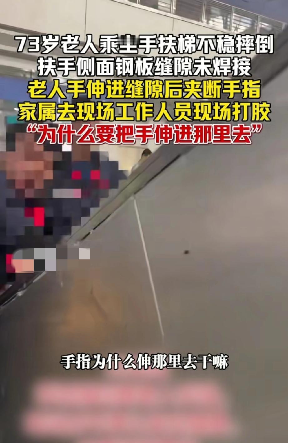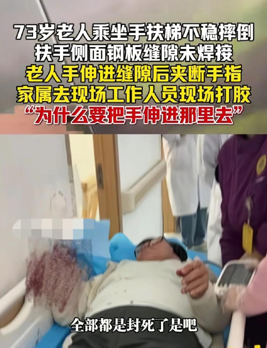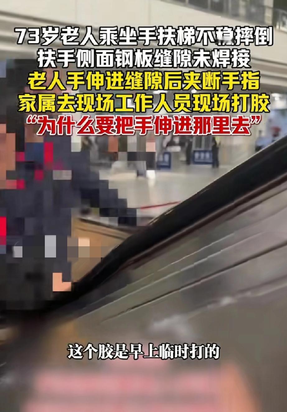 11月25日,广东(发布)。73岁老人乘坐电梯老人手伸进手扶梯缝隙后夹断手指,家属去现场,工作人员正在临时打胶,面对质疑反问道:“为什么要把手伸进那里去?” 该说不说,这个事情上,商场肯定要承担大部分的责任,不过临时补救也是没有问题的,就是这个工作人员的回复有点不近人情,完全可以婉转的回应一下,这样伤者家属心里也会好过一点! 各位看官,你们觉得呢?