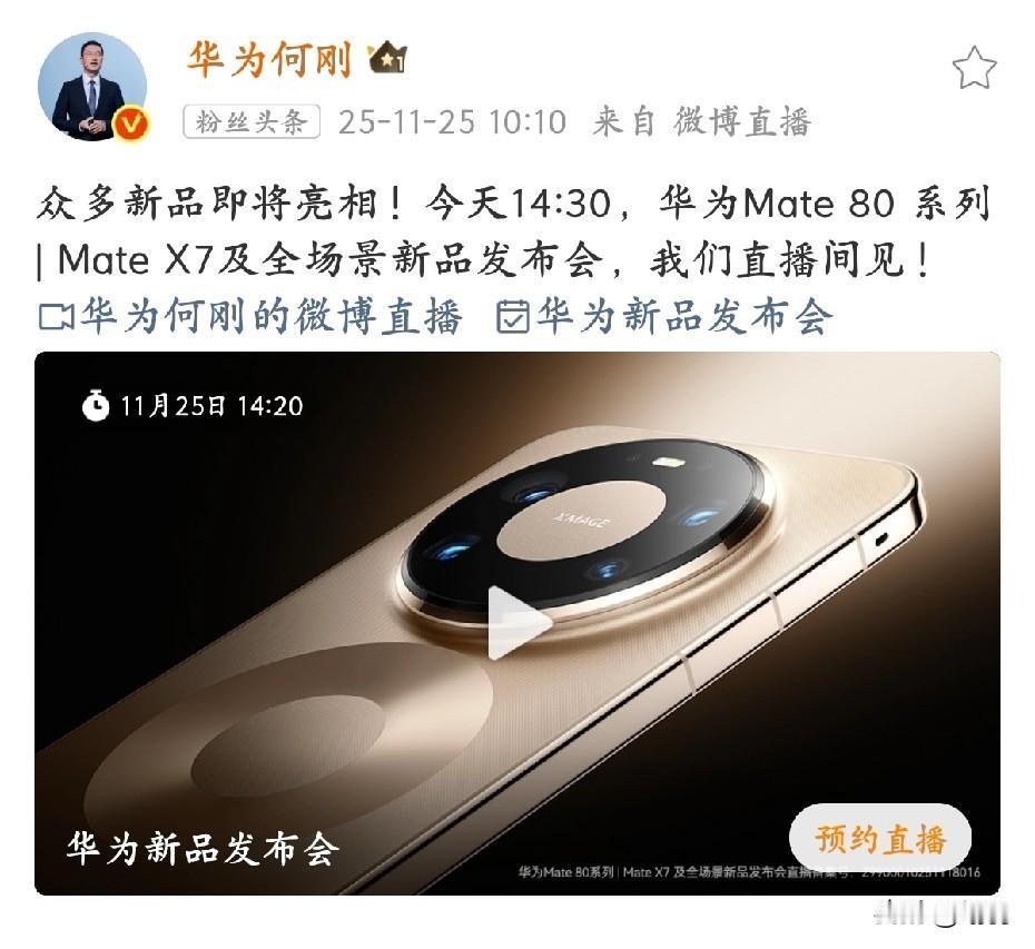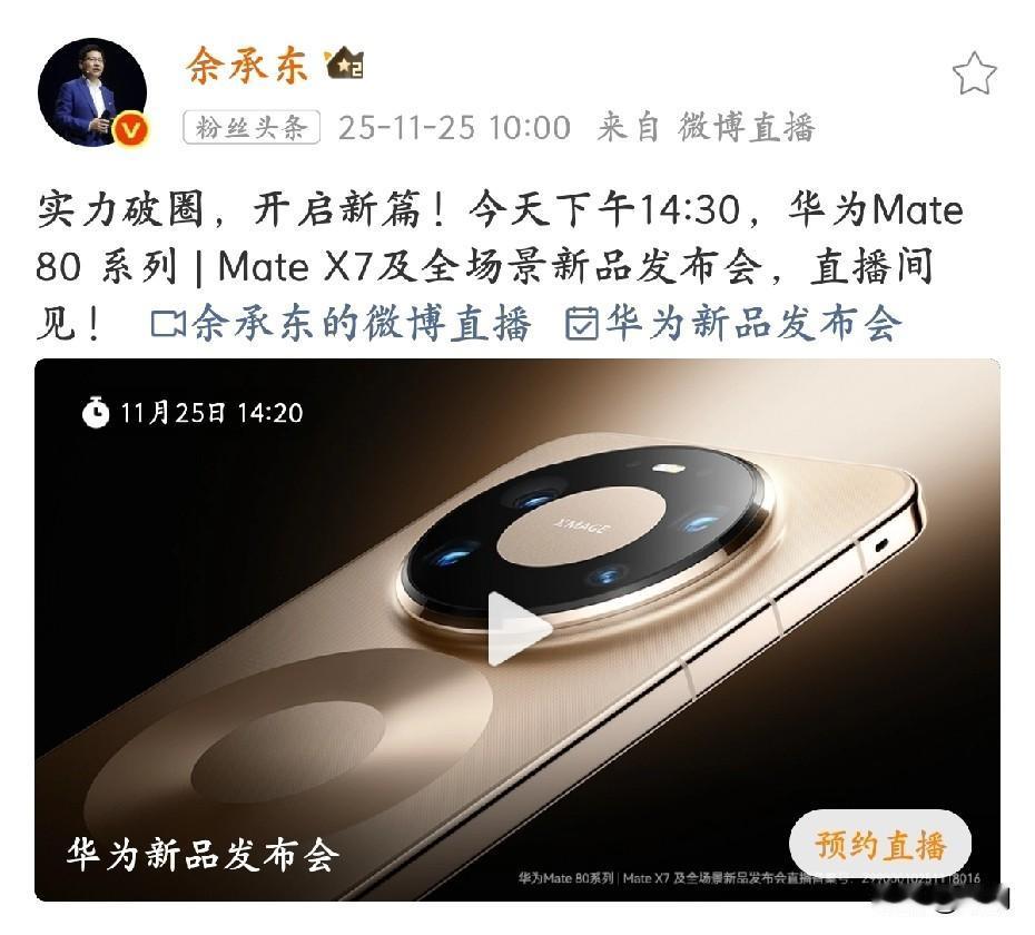 华为发布会即将开启 老余与何刚邀大家共赏线上直播 虽是线上直播发布 但从目前发布会的消息来看 极为火爆 各大社交平台均有直播 发布会预约量也十分庞大 今天下午的发布会 定是国产数码科技的一场盛宴 众人翘首以盼 望华为尽快发布、开售 不过,若未提前预定 短期内恐难买的到喔! 华为手机 华为发布会