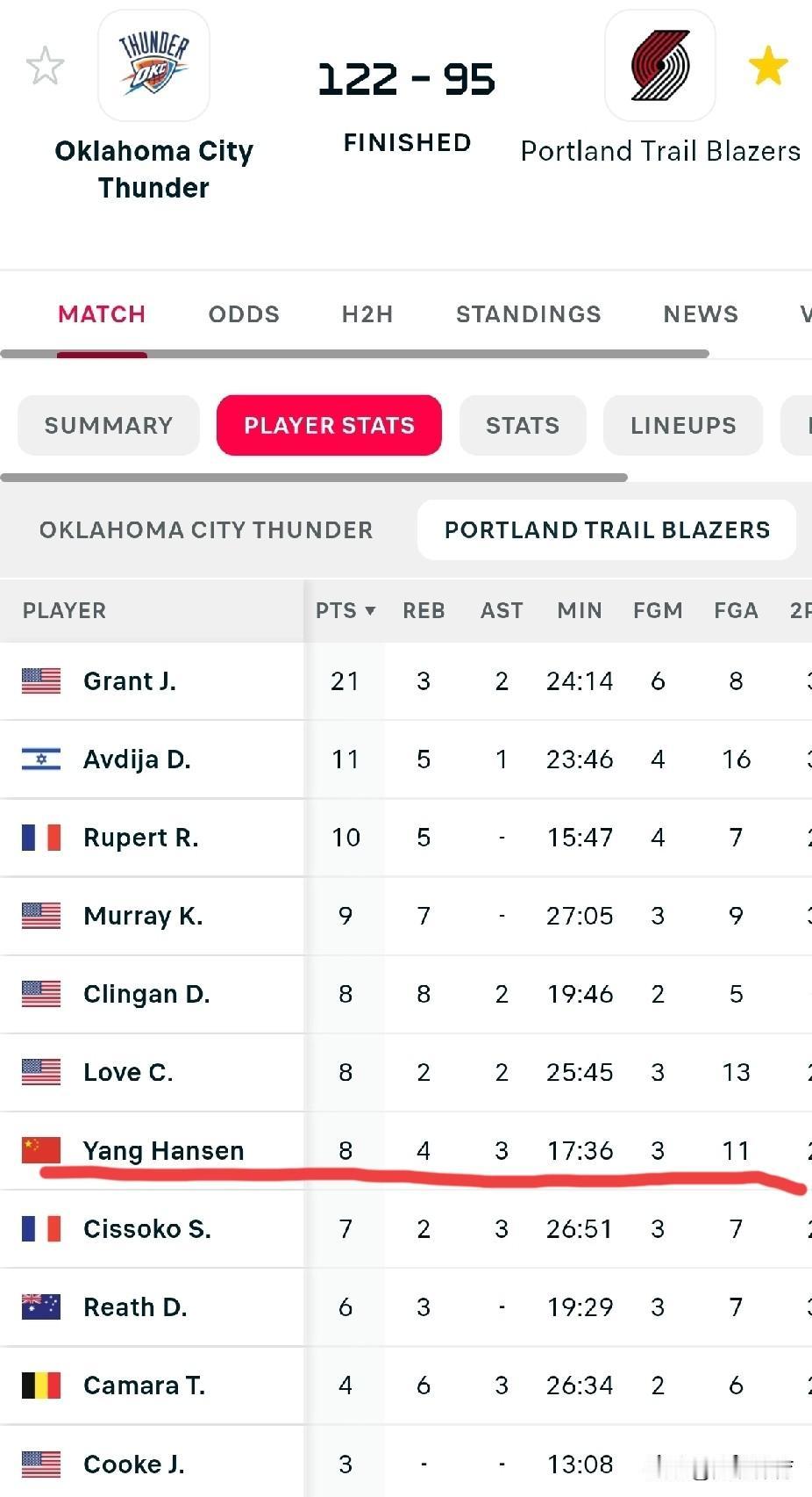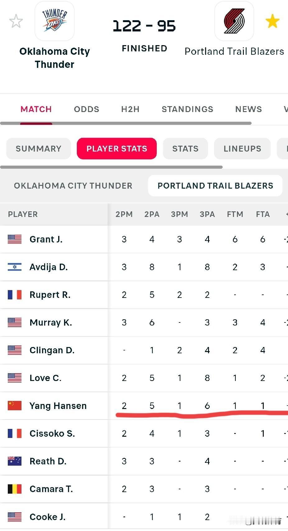 杨瀚森与开拓者队其他球员技术统计对比(2025-11-24,开拓者VS雷霆) 杨瀚森,8分4篮板3助攻 投篮:两分球5中2,三分球6中1,罚球1中1。 上场时间:17分36秒