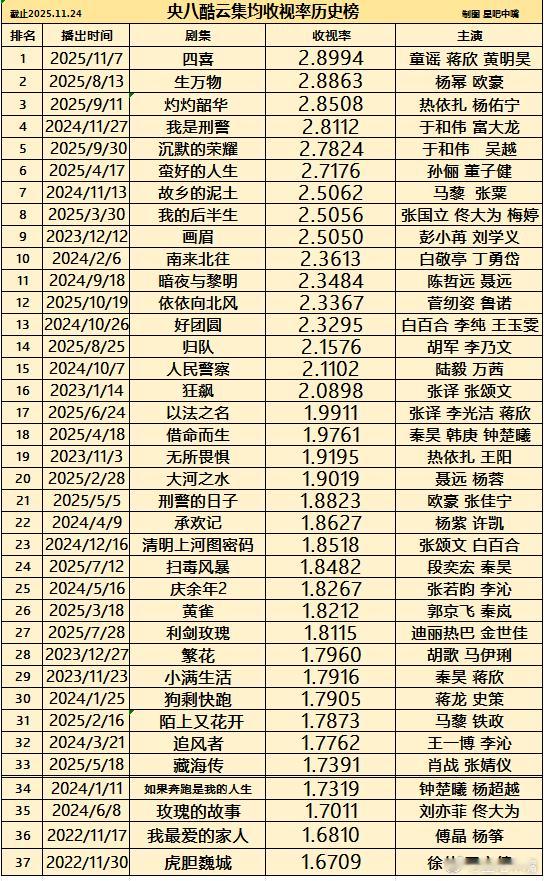 2014年12月至2025年11月央八黄金档电视剧酷云集均收视率历史榜单!童谣 蒋欣 黄明昊《四喜》勇夺历史榜第一位,史冠。冷知识:2014年12月才开始有酷云实时收视率。