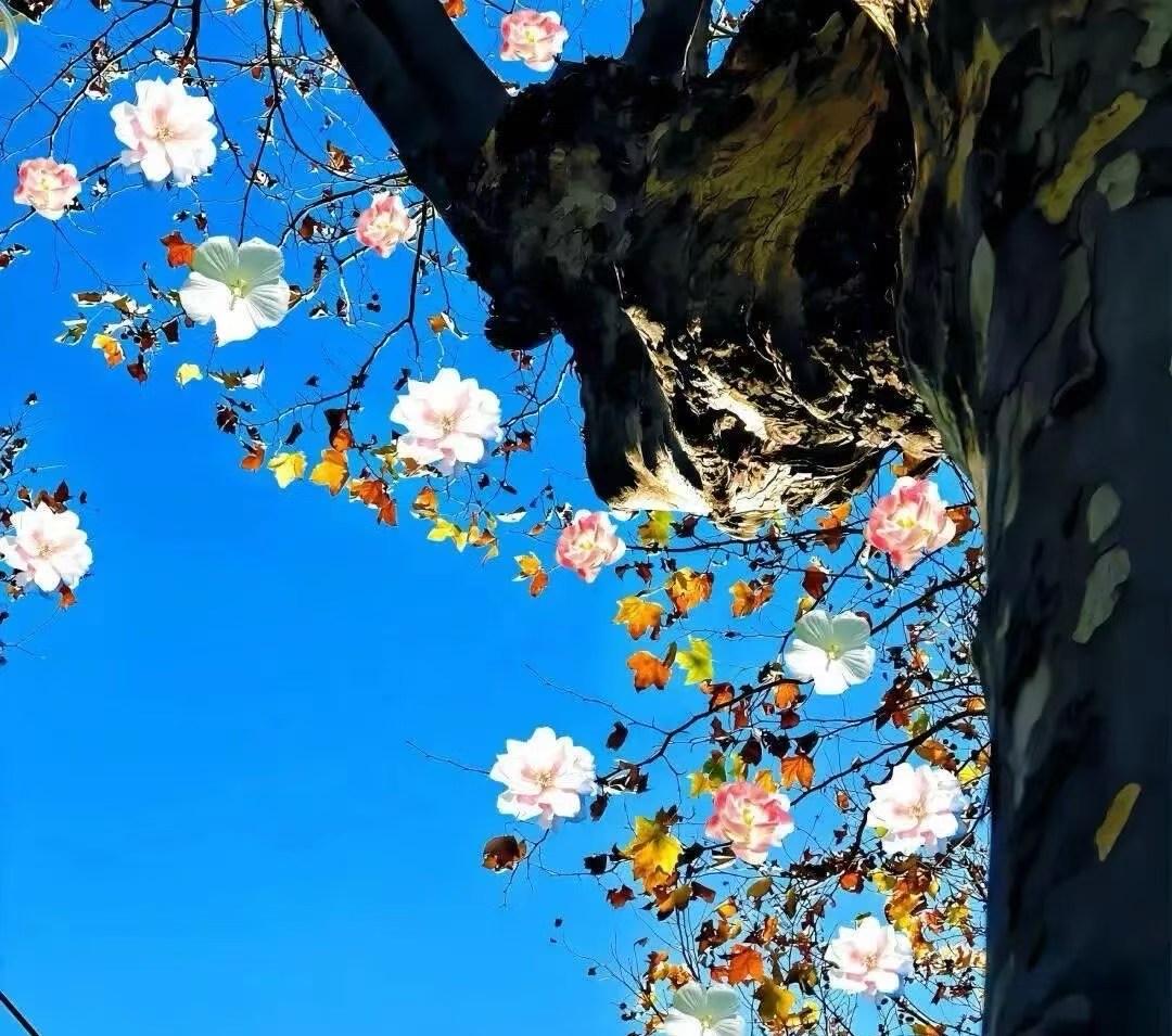 冬日暖阳下的静谧时光,蓝天白云,落叶飘零。