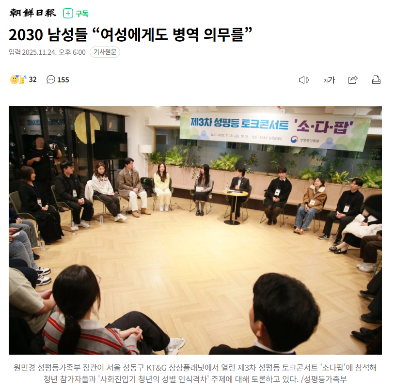 【韩国2030一代男性认为:女性也应承担兵役义务】 "也应赋予女性兵役义务。""男的都说是因为去军队而错失很多就业机会,但是,你看大企业的入职率低吗?"在21日由韩国性别平等家庭部主办的"性别平等脱口秀"上,2030一代的男女围绕"军队"问题展开了激烈争论。男性们认为"只有男性去军队是有问题的",而女性们则表示"女性即使想去军队,现实情况也无法去,这不合理"。性别平等脱口秀是性别平等家庭部为缩小青年男女在性别平等认知上的差距而设立的场合,预计将持续到下个月,共举行5次。当天有19名20-39岁青年(男性7名,女性12名)参加。男性参与者们就军队问题主张"女性也应履行兵役义务"。30多岁的男性金某说:"社会就这样规定了只有男性去军队","从长远来看,女性也应被赋予兵役义务,即使不是服满1年6个月,至少也应接受基础军事训练。"另一位30多岁的男性金某也表示:"说军队是性别问题的理由很简单,因为去的人大部分是男性","(国家)在以极低的代价使用年轻人,为了让男性们不感到委屈,希望将军队打造成一个能提供良好机会和就业岗位的地方。"女性参与者们则表示:"又不是我们决定让男性去军队的,感到委屈。"30多岁的女性吴某说:"只有男性去军队是国家层面的决定。并不是女性主张男性应该去的,但似乎有很多'你们也去军队试试看'的想法,这让人感到委屈。"她接着说:"据说男性们因为去军队错失了很多(与就业相关的)机会。那么大企业的男性入职率应该低才对,但事实并非如此。"也有意见指出,即使女性想去军队,目前军队内的设施也不是女性可以生活的环境。30多岁的女性李某说:"我国人口一半以上是女性,但军队并未配备能够容纳这些女性的设施","从女性的立场来看,如果想着是去学习保护自身的技术,那么军队的两年并不可惜。"