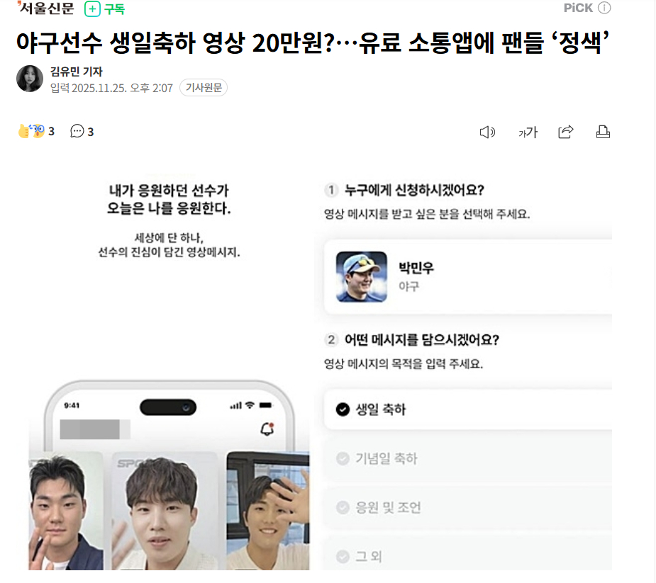 【韩国棒球球员20万韩元生日祝福视频惹争议,付费沟通APP引发粉丝不满】 一款能让粉丝与棒球球员进行1对1聊天、并能收到球员生日祝福视频的付费沟通APP近日登场,引发了争议。虽然其宗旨是像偶像组合的"Bubble"服务一样,让粉丝能与球员直接收发信息,但棒球粉丝们却持保留态度,表示"球员需要专注于比赛,这似乎会成为一种干扰"。该服务由一家体育经纪公司运营,是一款付费沟通APP,其旗下球员朴建宇(NC)、元兑仁(三星)、安现民(KT)、林昶睽(LG)等球员均已参与。粉丝支付月费后,即可与球员进行1对1私信交流,还能观看球员亲自发布的帖子和未公开照片。此外,若支付20万韩元,还包含一项功能:可以收到来自球员的生日或纪念日祝福视频。该服务虽已推出数月,但直到最近才通过棒球社区被广泛知晓,争议也随之扩散。虽然排球或电子竞技领域已有引入付费沟通服务的先例,但有人担心,将其原封不动地应用到赛程和强度都不同的棒球领域,可能会给球员带来过度负担。实际上,去年Faker所属的T1也曾准备类似服务,但考虑到粉丝的反对,最终将发布时间调整到了"英雄联盟全球总决赛"之后。该经纪公司还发布公告称,将举办NC队朴建宇、朴敏宇的付费粉丝见面会。但俱乐部方面则表示"现在才得知该内容,正在确认具体详情"。棒球粉丝们纷纷表达了担忧:"这过度将球员偶像化了"、"担心球员无法专注于比赛"、"收到恶意私信时责任归属不明确"等等。