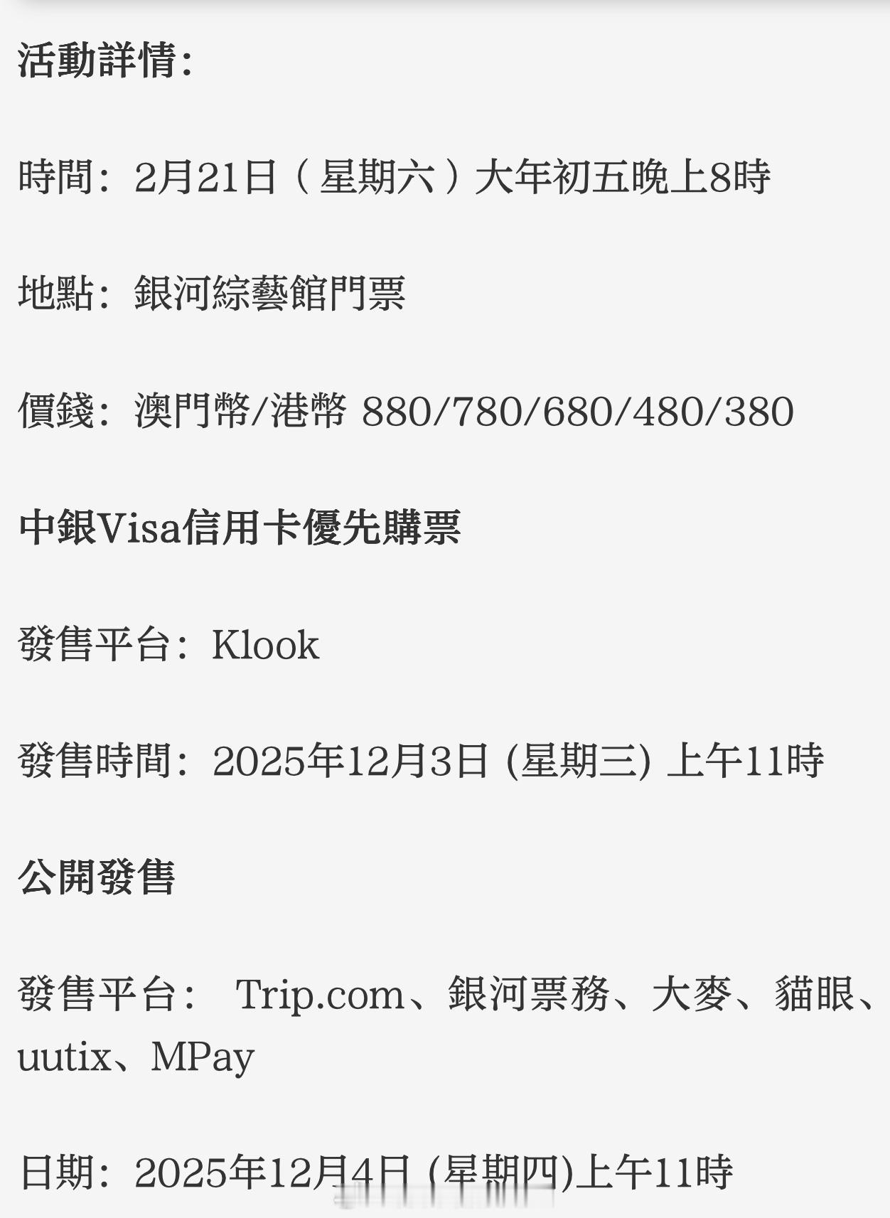 「歐陽萬成賀年Show 2026登陸 …即睇購票詳情 … 大公文匯全媒體報道,港產 ( )演員 ( )早前在 紅館舉行一連五場棟篤笑,大受好評。歐陽萬成將於2026年2月21日(星期六)大年初五晚上8時在銀河綜藝館舉行「歐陽『萬』事『成』意賀年Show」,更預告會有驚喜嘉賓。活動會在Klook優先開賣門票,並會在銀河票務、大麥、貓眼、uutix、 Trip、MPay開始公開發售 ..」入內看全文: ..…….