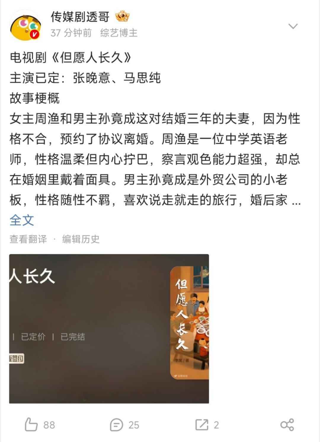 张晚意马思纯新饼《但愿人长久》那种家庭言情剧,女主是英语老师性格温柔但内心拧巴,察言观色能力超强,男主性格随性不羁,喜欢说走就走的旅行,婚后家庭责任感不强。。怎么感觉不太适配张晚意呢🍉主已经否认是海魂衫改名,讲述的是结婚三年的夫妻性格不合,两人看似要走向婚姻的终点,但一场突如其来的家庭变故,让他们的关系和整个大家庭都发生了转变。