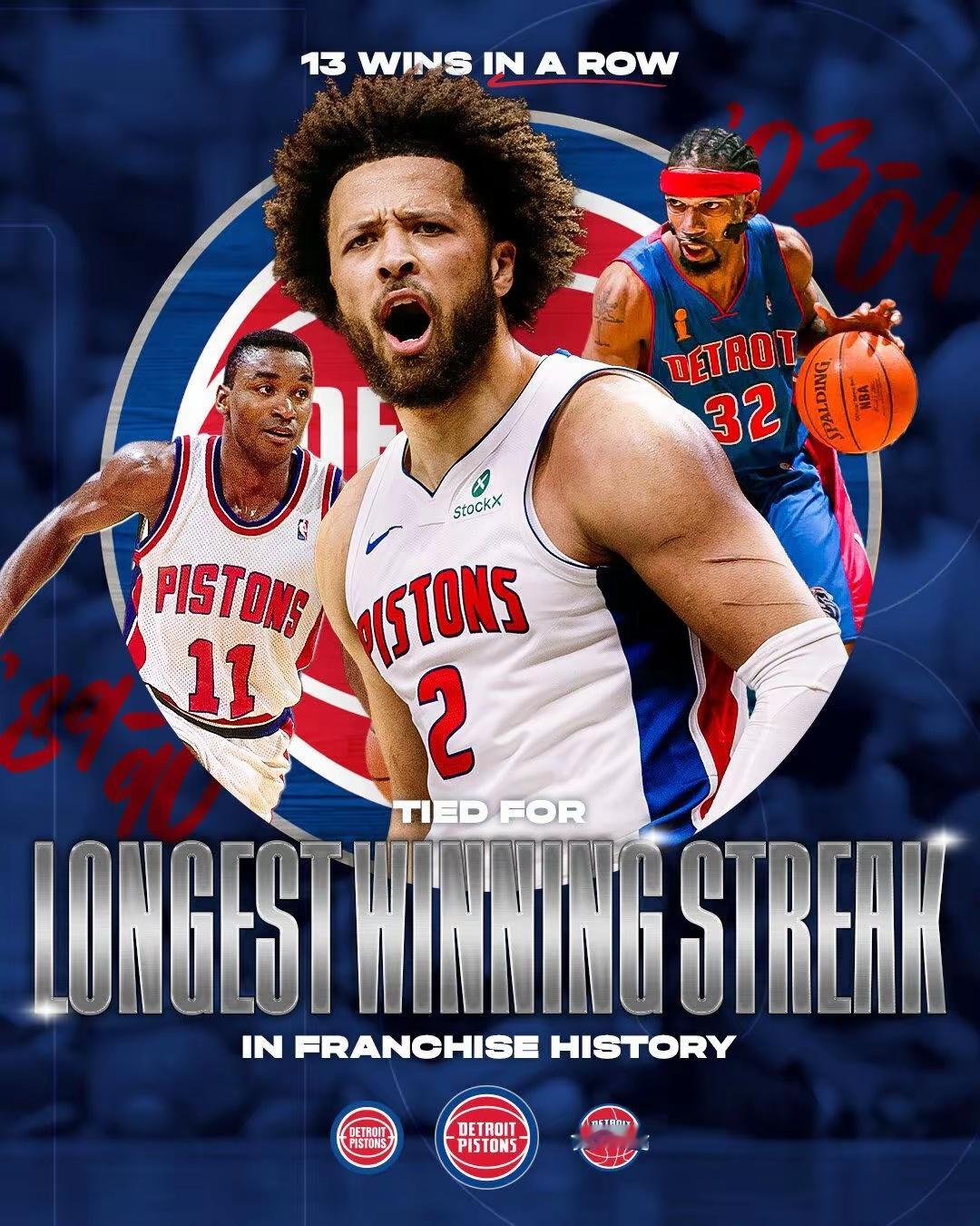 追平队史连胜纪录!活塞豪取十三连胜 北京时间11月25日,底特律活塞客场122-117险胜印第安纳步行者,豪取十三连胜追平队史最长连胜纪录。此前活塞曾先后在1989-90赛季和2003-04赛季取得过13连胜,值得一提的是,他们在这两个赛季最终都赢得了NBA总冠军。活塞下一场比赛将客场挑战波士顿凯尔