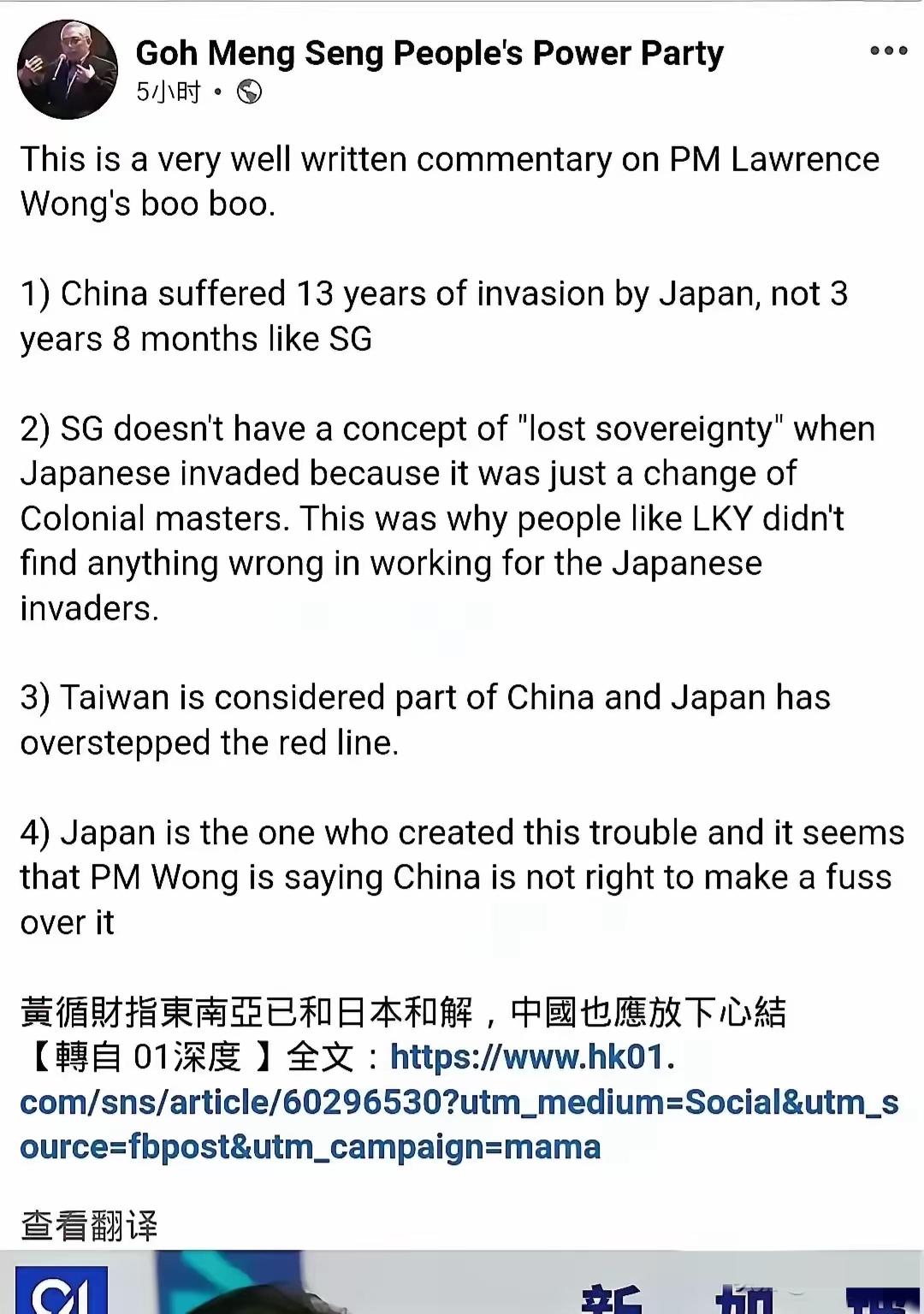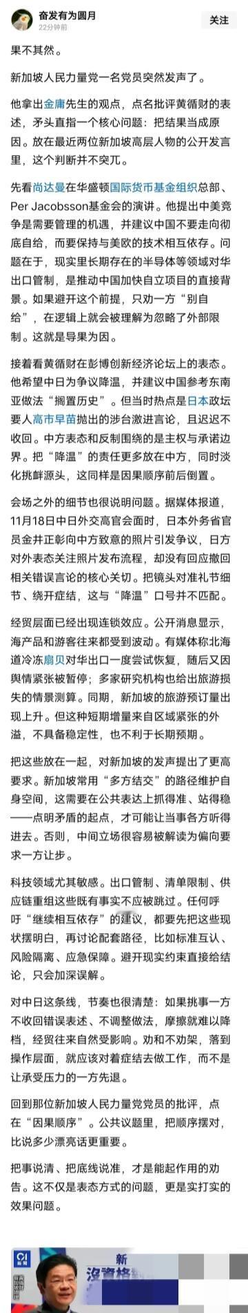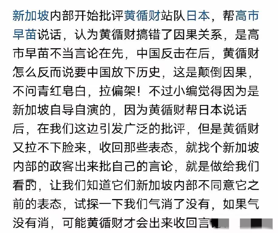 俗话说得好,老百姓的眼睛是雪亮的,自从新加坡总理为日本高市早苗站台说话后,整个东南亚华人都在狂批这个新加坡总理! 今天看唐湘龙的节目,有很多新加坡华人和其他东南亚华人跑到唐湘龙节目留言痛批黄循财帮日本人站台,明明是高市早苗挑衅在先,黄循财却要求中国要大度,还说新加坡跟其他东南亚国家已经跟日本和解了,要日本在东南亚发挥更大的安全作用,很多东南亚华人非常生气,凭什么代表他们说跟日本和解了,这是数典忘祖! 在我看来,这个时间段新加坡总理黄循财站队日本跳出来当出头鸟,给中国指手画脚,本质上还是新加坡从军事和经济上都严重依赖美西方,而且相对于美西方这些强盗,中国方面相对来说还是比较克制比较内敛,所以这些弹丸小国才敢对东方巨龙指手画脚!另外一方面就是最近中国开阔北极航道,彻底影响了新加坡从马六甲海峡收取中国费用,所以黄循财这个时间段跳出来指责我们,就是想恶心我们罢了! 现在有新加坡华人认为这是新加坡精英的失败,它们接受西方的教育,但是不读历史,根本没资格做总理,新加坡多少华人的祖辈被日本人屠杀,现在黄循财轻飘飘一句话就和解了,凭什么和解,如何和解?现在新加坡国内已经有人在呼吁让黄循财下台了,而且它必须下台!
