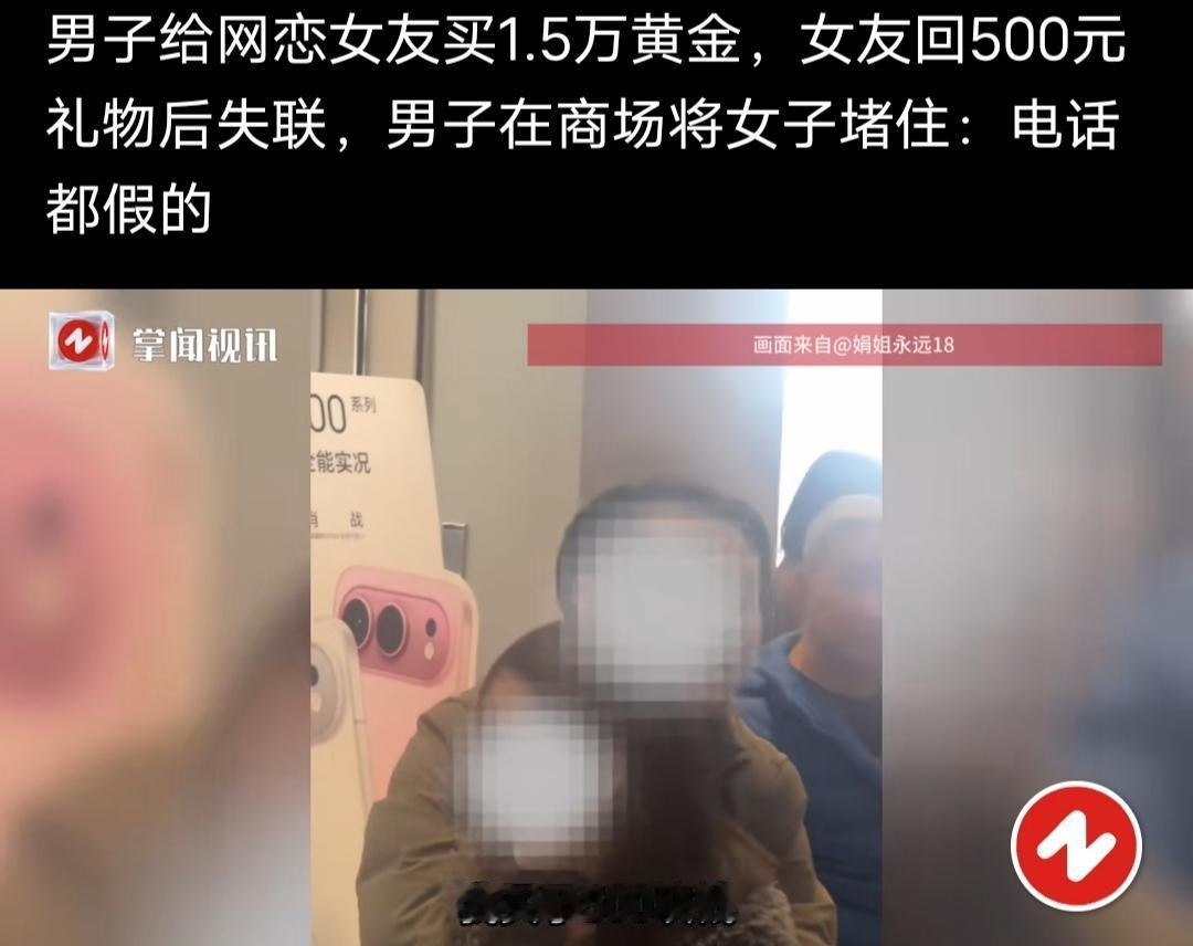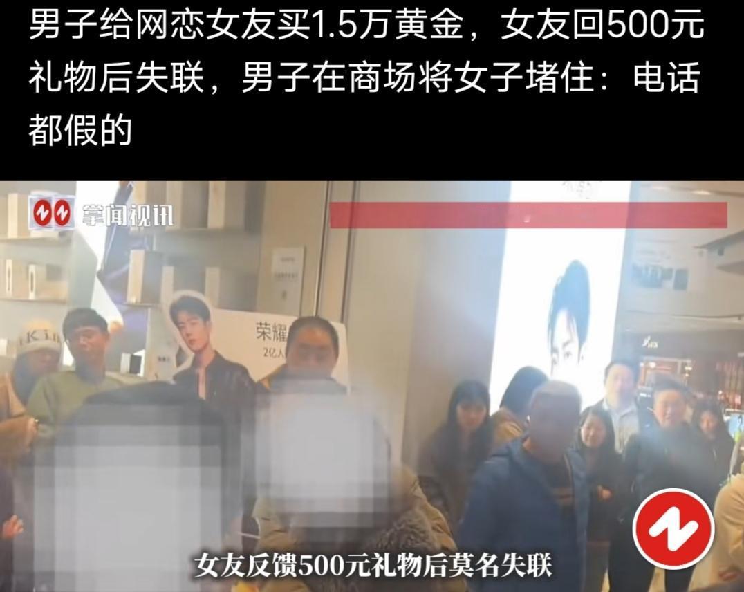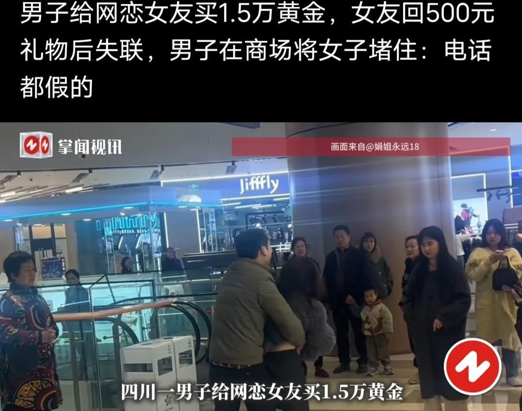 男子给网恋女友买1.5万黄金,女友回500元礼物后失联,男子在商场将女子堵住说电话都是假的。刚在相关媒体平台看到的这个报道,四川宜宾一个男的,跟网恋女友奔现,第一次见面就给人买了1.5万黄金,女的也给男子买了500元的礼物作为回礼,然后就无故失联了,被女方删除拉黑了,男子说电话都是假的,联系不上。 于是男子又注册各种小号去钓这女的。最后,在商场将这女的堵住。估计这女的以为自己又钓到一个有钱的,可以给她买黄金,所以又去了商场,结果被男子抓住。 你说这男子聪明吧,他又被骗了,你说他笨吧,他又通过一些方法,将骗子抓住了。话说,现在还有人相信网恋这东西吗? 还是奉劝各位,理智些,有常识些,捂好自己的口袋,真正相处起来,了解清楚再施以真心和善意吧!