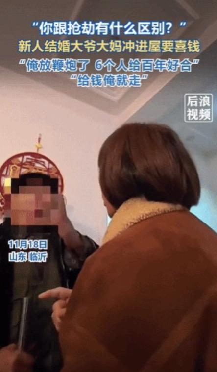 万万没想到!山东临沂一对新人结婚,不料一位大爷突然闯入新房“赶喜”。他声称自己放了鞭炮,要求新人给喜钱,一行6人每人都要,总共索要100元。婚礼现场的女子礼貌请大爷先出去等待,可大爷表示“不给喜钱就不走!” 婚礼变闹剧!山东临沂这幕太膈应人,网友怒了:这哪是讨喜,分明是明抢! 新人刚踏入婚房,还没来得及享受甜蜜,就被不速之客搅了兴致。 一个自称陈大爷(化名)的人,带着五个亲友突然闯进来。 张口就说门外放了鞭炮,要新人每人给 “喜钱”,总共 100 块。 他语气硬邦邦的,好像这钱是理所当然该给的。 新娘当场脸色发白,新郎也愣在原地,完全没料到会出这档子事。 负责现场管理的女子赶紧站出来劝阻。 “大爷,您先出去等安排,婚房不能随便进”,声音不大却透着坚定。 可陈大爷根本不买账,抬头瞪着眼,说话还挺冲。 “不给钱我就不走,你不当家说了不算”,说着就往房间里闯。 屋里的空气瞬间凝固了,新人满脸尴尬又无奈。 好好的喜庆氛围,一下子变得又紧张又压抑。 女子当场急了,提高嗓门回击。 “不听安排一分钱没有,你这跟抢劫有啥区别”,话里满是愤怒,也透着保护新人的决心。 周围的宾客开始小声议论,几个年轻人悄悄围过来。 没人敢直接冲突,有人掏出手机,把这荒唐的一幕录了下来。 视频发到网上,网友们炸开了锅。 “这哪是传统习俗,就是借着结婚耍赖”,吐槽声一片。 还有人说 “结婚是一辈子的大事,被这么一闹,心里得多堵得慌”。 大家都觉得,陈大爷这行为太过分,把喜庆日子搅得乌烟瘴气。 其实这种 “赶喜” 的说法,原本是图个热闹。 过去都是象征性送点祝福,新人回个小红包,图个皆大欢喜。 可现在有些人变了味,借着习俗的名义强行要钱。 不仅扰乱秩序,还破坏了别人的好心情,完全变了质。 懂法的人说,婚礼属于私人空间。 没经过允许闯进去索要财物,这已经涉嫌侵权,甚至可能违法。 不能拿 “年长”“传统” 当借口,就肆意侵犯别人的权益。 法律和道德都不允许这种无理索取的行为。 最后还是宾客们出面协调,才总算稳住了场面。 可新人和家人心里的疙瘩,哪那么容易解开。 好好的婚礼留下了遗憾,这份不快估计要记很久。 传统习俗值得尊重,但绝不能成为耍无赖的挡箭牌。 对此,你有什么看法呢? 信息来源: 后浪视频