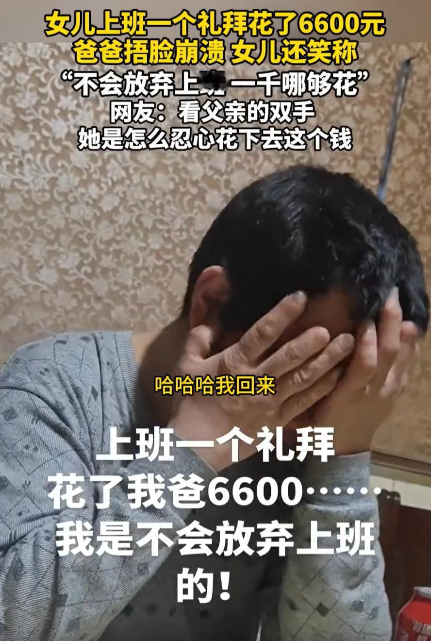没有公主命却得了公主病!上海,一位女生上班一个礼拜辞职了,虽然自己只挣了1000块钱,却眼睛都不眨花了父亲6600块钱,当她向父亲炫耀自己1000元根本不够花时,父亲捂着脸崩溃痛哭   最近刷到一条让好多人心里发沉的视频,视频里上海老弄堂的一间小客厅里,60瓦的灯泡把空气烘得有点闷,穿灰色起球旧毛衣的男人坐在掉漆的木椅子上,右手食指和中指缺了半截,剩下的指节上全是深褐色的老茧和裂口,他就用这双手死死捂住脸,肩膀一下一下轻轻抖着,半天没发出一点声音。   旁边二十岁出头的女孩举着手机凑过来,发梢还带着刚烫的卷,笑着晃他的胳膊:“爸,你别愁啦!我上班一周挣了1000块,但是花了你6600,1000根本不够花,我就辞职回来陪你啦!”   这件事里的爸爸姓王,是附近货运站干了二十多年的装卸工,街坊邻居都熟:他每天凌晨四点半就骑着电瓶车上路,仓库里的纸箱、建材一包能有七八十斤,他弓着背一趟趟从货车搬到库房,搬满一整车能挣80块钱。   手上的残疾是十年前搬钢材时被压的,当时怕耽误干活又舍不得医药费,只去社区医院简单包扎,后来就落下了终身残疾。   他的女儿刚从职校毕业,找了份月薪4000的行政工作,刚去一周就打了辞职报告。这七天里,女儿每天都找不同理由找爸爸要钱:周一说“公司要求穿正装,旧衣服太土”,爸爸转了1200,她转头买了网红店的“轻熟风套装”,试了一次觉得显胖,又加300换了另一款,旧的直接扔了垃圾桶。   周二说“新人得跟同事搞好关系”,拿了800块请人吃人均200的日料,其实她跟那几个同事连名字都没记全,周三说“通勤的鞋子磨脚”,要了500买了双网红运动鞋。   周四看见朋友圈有人晒新款彩妆,直接要1500下单了一整套,拆快递时还笑着说“这牌子我种草半年啦”到了周末,又说“跟朋友逛商场,包包打折不买亏”,拿了1600,最后七七八八加起来,刚好花光了爸爸的6600块。   等女儿辞职回家,还兴高采烈地跟爸爸“报喜”,说辞职理由是“爷爷脑梗加重,要陪他去外地看病”,可爷爷每天都能去弄堂口的公园遛弯,连咳嗽都少。   爸爸听见这话,原本握着搪瓷茶杯的手顿了一下,慢慢抬起那只残疾的手捂住脸,过了好一会儿才闷着嗓子问:“你知道我搬多少包货,才能攒够你买衣服的1200吗?”   女儿摇摇头,把刚做的美甲伸到他面前:“爸你别想这些累人的事啦,你看这300块的美甲好不好看?”   爸爸没接话,只是把脸埋得更低,他那件旧毛衣领口磨得发毛,是穿了五年的老伙计,平时在仓库吃盒饭,连10块钱一份的都要挑素的,却在女儿发“没钱”消息时,永远是立刻打开手机银行转钱,转账备注永远是“女儿买好吃的”。   视频火了之后,评论区里好多人跟着揪心:   有网友说:“看见他那只缺了手指的手,就知道这6600是他搬多少个通宵、扛多少包重物攒的,她怎么能笑着把这些血汗钱花在没用的地方”   还有人说:“最扎心的不是花钱多,是她看着爸爸崩溃,第一反应不是心疼,而是举着手机继续拍视频”。   这件事让我们明白,不是年轻人不能花钱,也不是父母不该疼孩子,而是好多父母习惯把所有辛苦藏在孩子看不见的地方,爸爸从不在女儿面前揉发疼的腰,从不提搬货时被砸到的腿,只把皱巴巴的现金换成干净的转账发给她。   而被这样“捂着眼睛”宠大的孩子,很容易把这份不计回报的付出当成“理所当然”,没机会知道每一分钱沾着多少汗水,也没学会去看见长辈藏在身后的不容易。这不是谁的错,却成了最无奈的事:父母的爱太满,反而让孩子弄丢了“心疼人”的能力。   那么你们怎么看待这件事呢?欢迎在评论区说说你们的看法吧!
