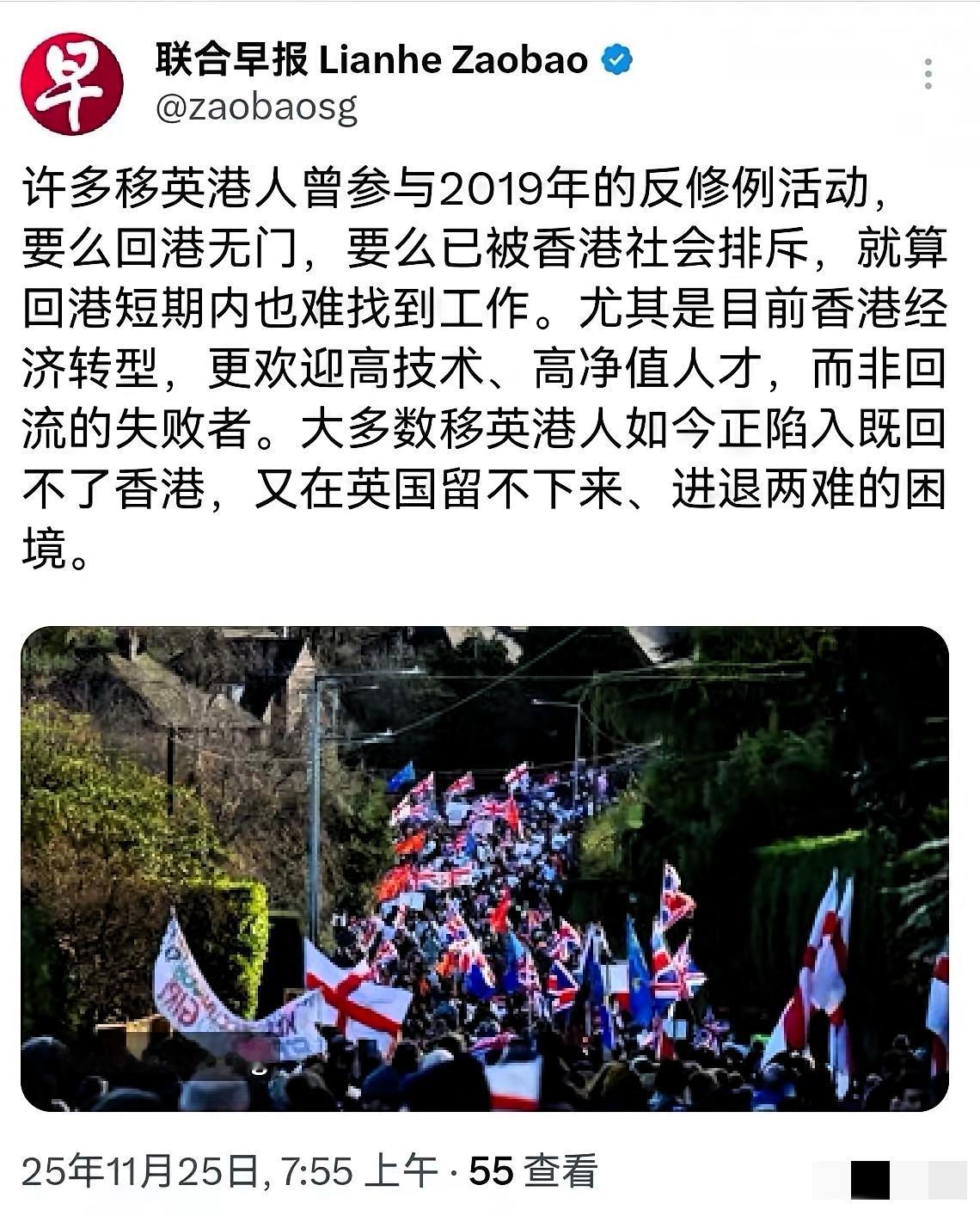 谁能想到,当年喊着“润去英国”的人,如今却卡在中英两国之间进退两难?《联合早报》的报道戳破了真相,这批拿着BNO签证的人,既留不下也回不来,纯属自己选的坑自己填。 英国当初抛出BNO政策,根本不是什么“人道主义庇护”,就是赤裸裸的政治算计——一边拿他们当施压中国的筹码,一边收割他们的资产和积蓄。可这些人偏偏当真了,以为自己是“特殊人才”,能在英国坐享优待,却忘了政客的承诺从来只看利益。 现在英国日子不好过,反移民压力越来越大,还想改善对华关系,自然转头就收紧政策。签证费用暴涨、永居年限翻倍,他们在英国学历不被认、工作找不到,只能干底层零工,连孩子上学都要付三倍学费。 想回香港?现实更打脸。如今香港要的是高技术、高净值人才,企业招聘看稳定性,谁愿意要当初轻易跑路、还可能有不良记录的人?说白了,他们最大的错误就是把别人的政治棋子当救命稻草,把背叛故土的选择当捷径。 世界从来没有免费的午餐,选择大于努力但不能选错方向。你觉得这些人还有回头路吗?如果是你,会怎么选?