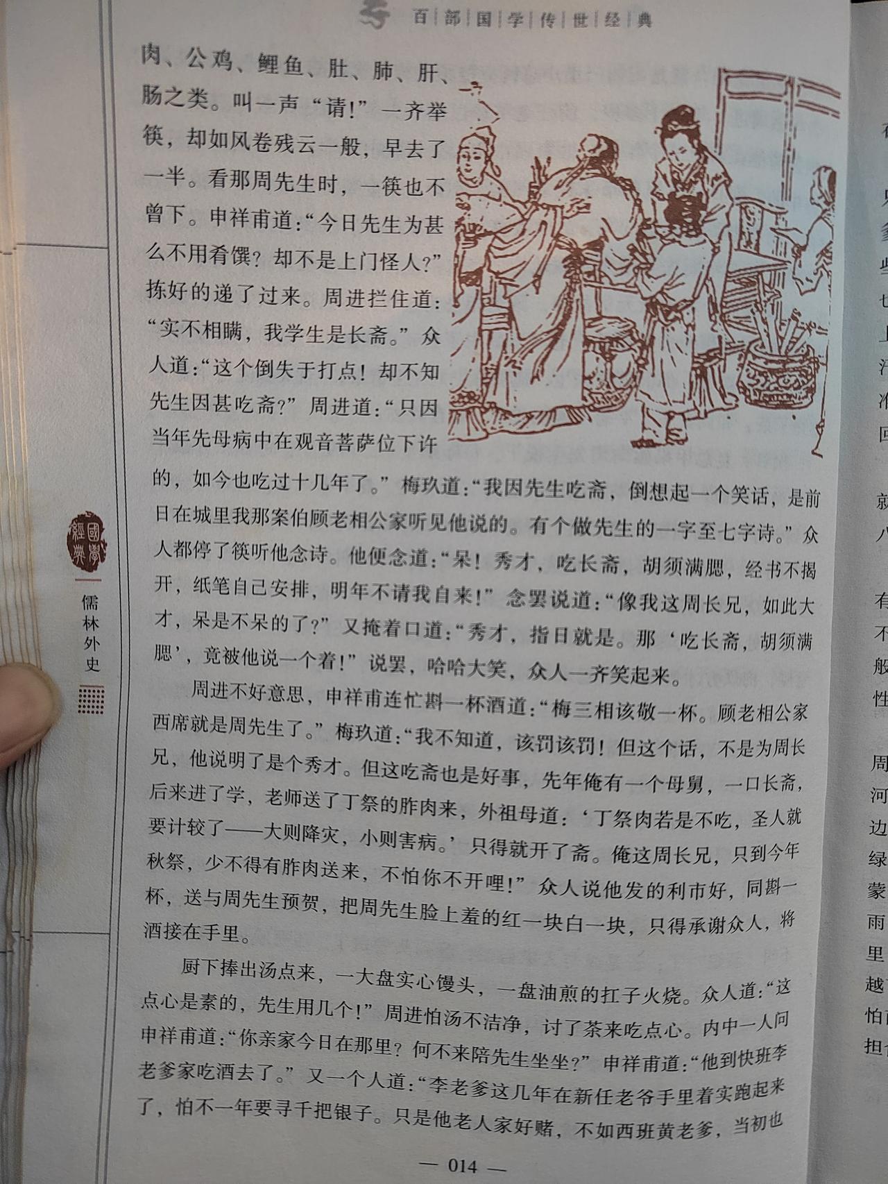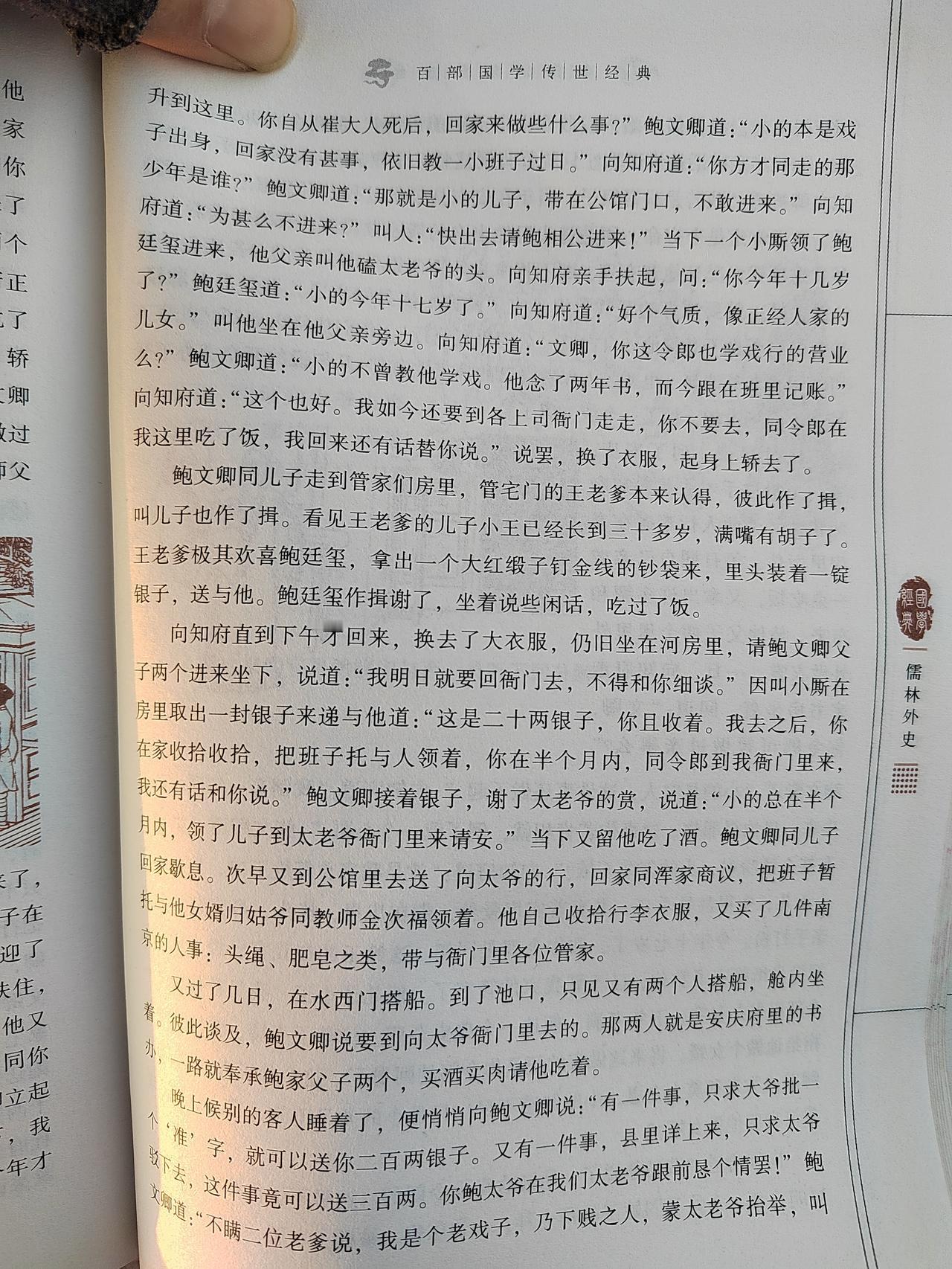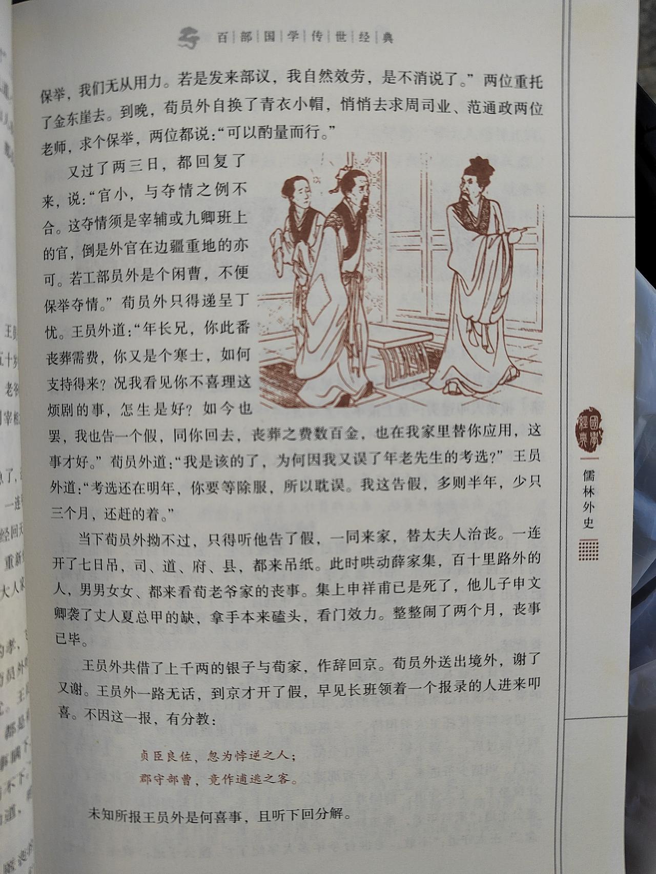 读《儒林外史》,尽是人情世故,和尚也无法置身事外 前段时间,从图书馆借阅了《儒林外史》,并没有读完,只随意翻阅了其中一小部分。 人情世故在《儒林外史》中贯穿始终,可谓连篇累牍,篇幅占比很大。本书第一回入场的主人公王冕洁身自爱,不愿卷入官场是非,虽经恩人多方周旋,仍不得不走向逃亡之路,而世人念兹在兹的仍是从未走马上任过的官职。 待人接物是人情世故的核心环节之一,这点连和尚也不能免税。面对有权有势的金主,和尚如同仆人,唯唯诺诺,几乎没有了和尚应有的样子。