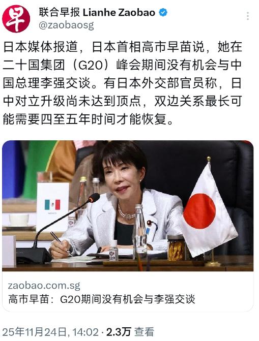 日本媒体11月24日报道,日本首相高市早苗说,她在二十国集团(G20)峰会期间没有机会与中国总理李强交谈。有日本外交部官员称,日中对立升级尚未达到顶点,双边关系最长可能需要四至五年时间才能恢复。 这种论调,与其说是客观分析,不如说是一种精心设计的政治表态。 高市早苗没机会和李强总理交谈,这件事本身就极具象征意义。G20峰会是什么场合?那是全球主要经济体领导人坐下来谈合作的平台。 如果两国关系真的只是有些小摩擦,那么一场场边的简短会晤,哪怕是握个手、点个头,都是完全可能实现的。连这种最基本的外交互动都未能发生,只能说明中日之间的冰层,比外界想象的要厚得多。 日本外交官员那句“对立尚未达到顶点”,听起来简直像是在自我预言。他似乎在暗示,未来日本还准备采取更多措施,让两国关系继续下滑。 这种言论完全违背了外交官应有的职责,外交官的职责是化解矛盾、增进理解,而不是火上浇油、预言恶化。 这番话暴露出日本政府在处理对华关系上,已经放弃了改善的努力,转而采取一种消极对抗的姿态。 至于那个“四到五年恢复期”的说法,更是暴露了日本方面的战略误判。他们似乎认为,中国会在日本的持续挑衅下无动于衷,或者认为时间站在日本这边。 他们把改善关系的责任完全推给中国,摆出了一副“只要你先让步,我们再考虑”的傲慢姿态。这种想法,完全是对当前国际力量对比的误读。 高市早苗政府上台后,在对华政策上表现出明显的强硬姿态。她频繁发表涉台言论,强化美日军事同盟,加速扩充军备。 这一系列操作,每一步都在踩中国的红线。现在反过来抱怨没有对话机会,这就像一个不停地往邻居院子里扔石头的人,却抱怨邻居不肯开门请他喝茶一样荒谬。 日本外交部的官员放出这种话,背后可能有多重考量。一方面,他们需要向国内选民展示自己的“强硬”,以迎合日本国内日益高涨的民族主义情绪。 另一方面,他们也是在向美国“表忠心”,证明自己是美国在亚太地区遏制中国战略的坚定执行者,即便为此牺牲本国经济利益也在所不惜。 这种短视的政治操弄,最终伤害的还是日本自己。中国是日本最大的贸易伙伴,两国经济早已是你中有我、我中有你。 中日关系的持续恶化,必然会对日本的出口、投资和产业链稳定造成沉重打击。当日本企业因为政治因素失去中国市场时,日本政府那些空洞的口号,能弥补他们的损失吗? 那个“四到五年”的预测,更像是一种拖延战术。日本政府可能希望利用这段时间,进一步深化与美国的捆绑,同时在国内完成军事解套的准备工作。 他们幻想着几年后,手上的筹码更多了,再回头来与中国谈判时,就能占据更有利的位置。这种想法,完全低估了中国维护自身核心利益的决心和能力。 高市早苗在G20的“失声”,其实是中国态度的一种清晰表达。中国已经明确表示,对话需要建立在相互尊重和诚意的基础上。 如果日本一边说想对话,一边却不断采取损害中国利益的行动,那么这种对话自然无从谈起。中国不缺对话的伙伴,但绝不接受在核心利益问题上的任何挑衅。 日本外交部官员的言论,也反映出日本政坛一种普遍的焦虑。他们看到了中国的快速发展,感受到了自身地位的相对下降,但又不愿意正视现实,调整心态。 于是,他们选择了一种最简单也最危险的方式——通过制造外部敌人来凝聚内部共识,通过对抗来掩饰内心的不安。 这种“对抗成瘾”的心态,正在把日本引向一条危险的道路。他们似乎忘记了,历史的教训是深刻的。 一个国家如果不能与邻为善,不能正确处理历史问题,不能顺应时代发展的潮流,那么无论它多么努力地扩充军备,都无法获得真正的安全。 中日关系的未来,并不取决于日本官员口中的“四到五年”,而取决于日本能否拿出真正的诚意和行动。 只要日本停止在涉台等问题上的挑衅,停止追随美国搞围堵中国的战略,中日之间的对话渠道自然就会畅通。关键不在于时间,而在于选择。 高市早苗和她的外交团队,现在需要做的不是抱怨和预测,而是深刻反思。他们需要想清楚,究竟是要做亚太地区和平稳定的建设者,还是要做地缘政治博弈的棋子。 这个选择,将决定日本未来几十年的国运,也将决定中日关系是走向对抗还是走向合作。那个所谓的“恢复期”,从日本拿出正确行动的那一刻起,就可以立刻归零。
