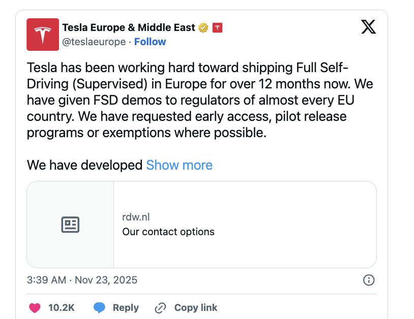 特斯拉宣布欧洲FSD预计获批日期,监管机构否认 特斯拉在推特上宣布了一个好消息,荷兰车辆管理局承诺在2026年2月批准FSD落地,对于多年来因监管限制无法在欧洲使用FSD的车主来说,这是一个重大进展。但是在特斯拉官宣后,荷兰车辆管理局否认了这一说法,称他们只是制定了特斯拉明年2月演示FSD的时间表,并未承诺批准其上路。 2022年初,马斯克曾表示特斯拉将在当年夏天在欧洲推出FSD,2024年底特斯拉表示FSD将于 2025年初推出,但最终也未能实现。 如今特斯拉并没有等待整个欧盟缓慢的审批流程同步进行,而是采用了“国家豁免”途径。一旦荷兰批准,其他欧盟成员国可以选择立即承认该豁免,从而有效地引发多米诺骨牌效应,最终在欧盟范围内推广FSD。 为了向监管机构证明系统的安全性,特斯拉已经在17个欧洲国家进行了超过100万公里的内部测试。然而,特斯拉并未公布这100万公里测试中的脱手数据。【来自懂车帝车友圈】