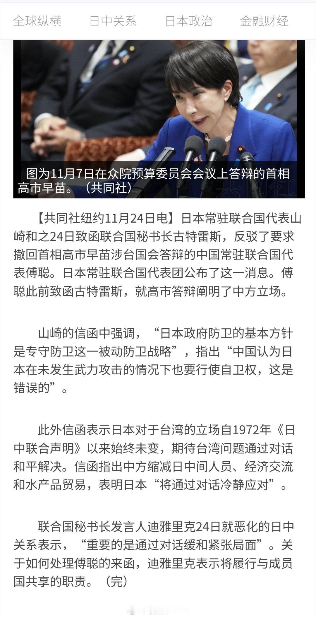 日本常驻联合国代表山崎和之致函联合国秘书长古特雷斯答辩反驳中方。