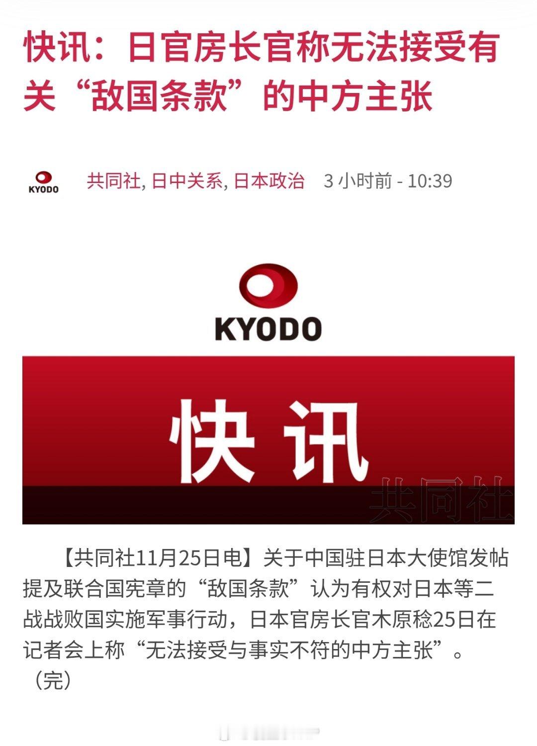 日本官房长官木原稔声称,无法接受有关“敌国条款”的中方主张