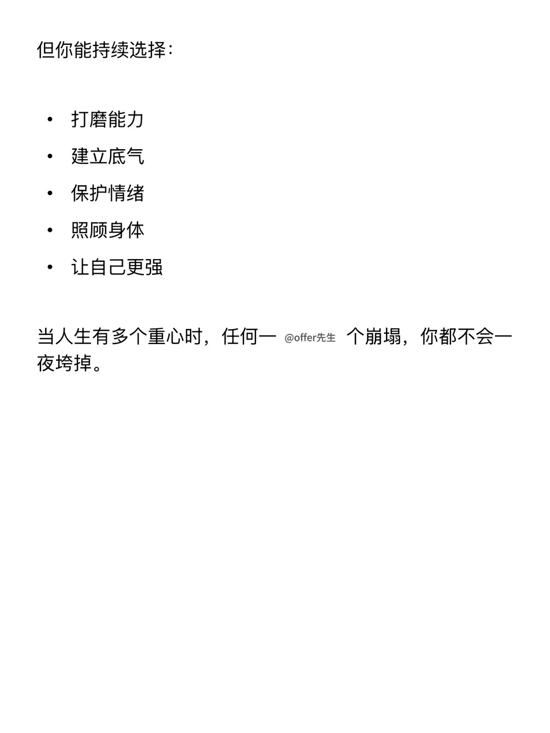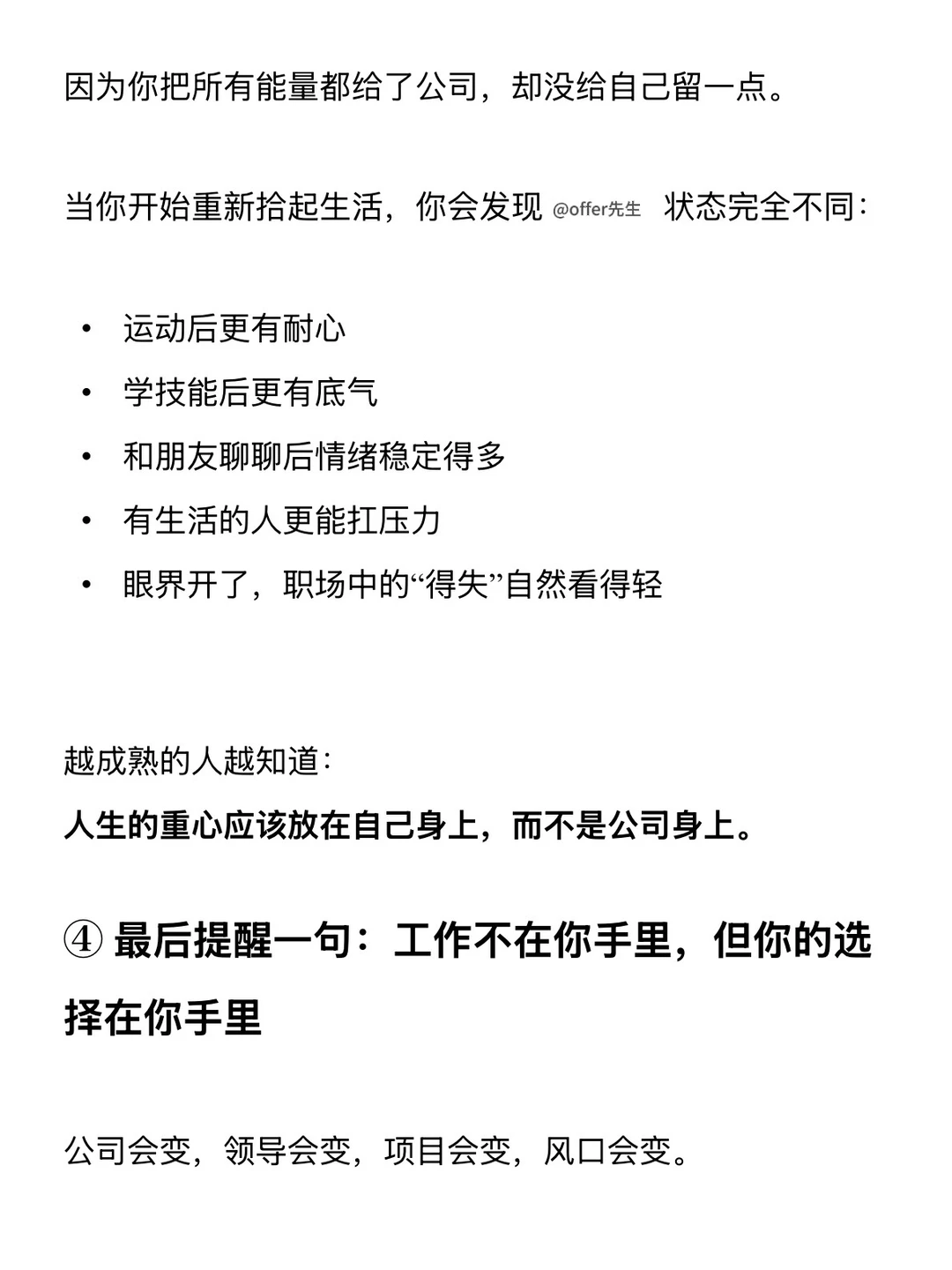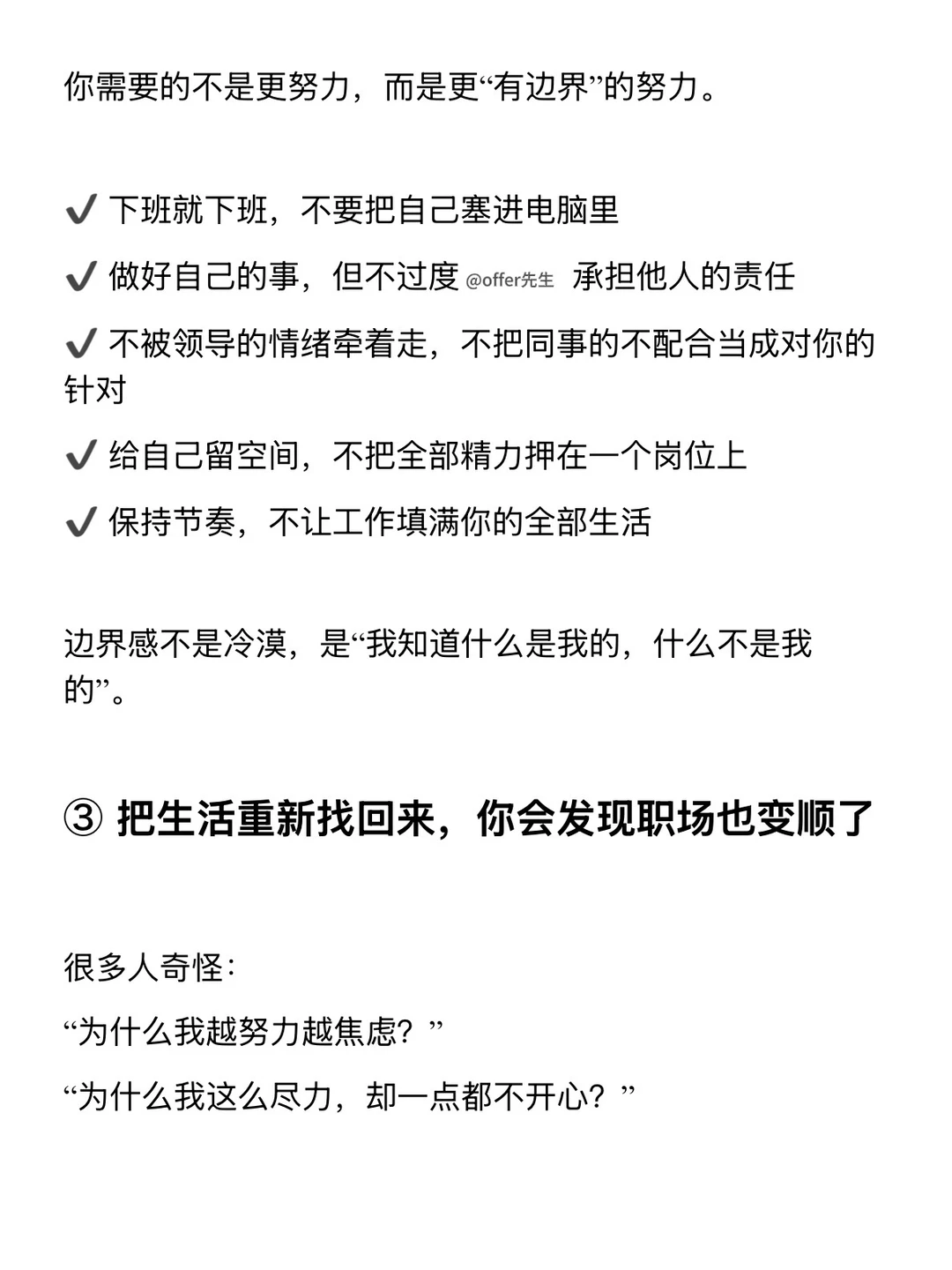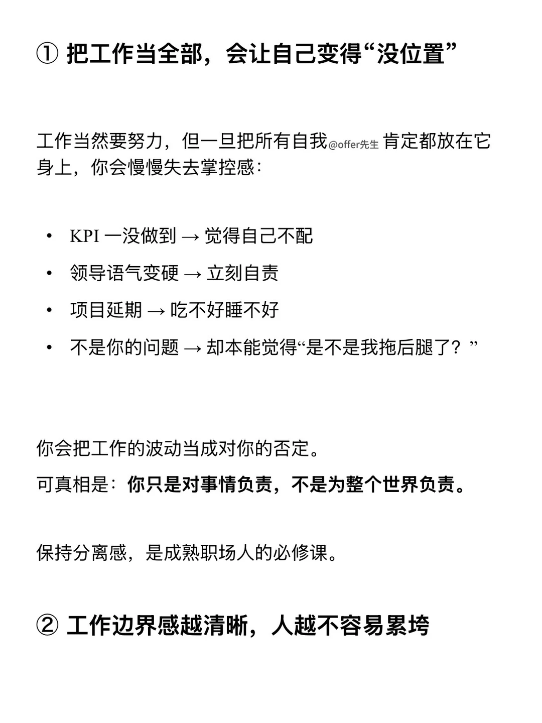 这几年见过太多把“所有意义”压在工作上的人:稍微受点委屈就大崩,项目卡顿整晚睡不着,领导一句语气重一点就开始怀疑人生。 可你仔细看,那些职场走得稳、越做越顺的人,都悄悄学会了一件事: 切记,工作只是工作。 它不是全部,也不是你自我价值的唯一入口。 · 一个认真分享“找工作”干货的账号,真诚、有料、不说空话 ·