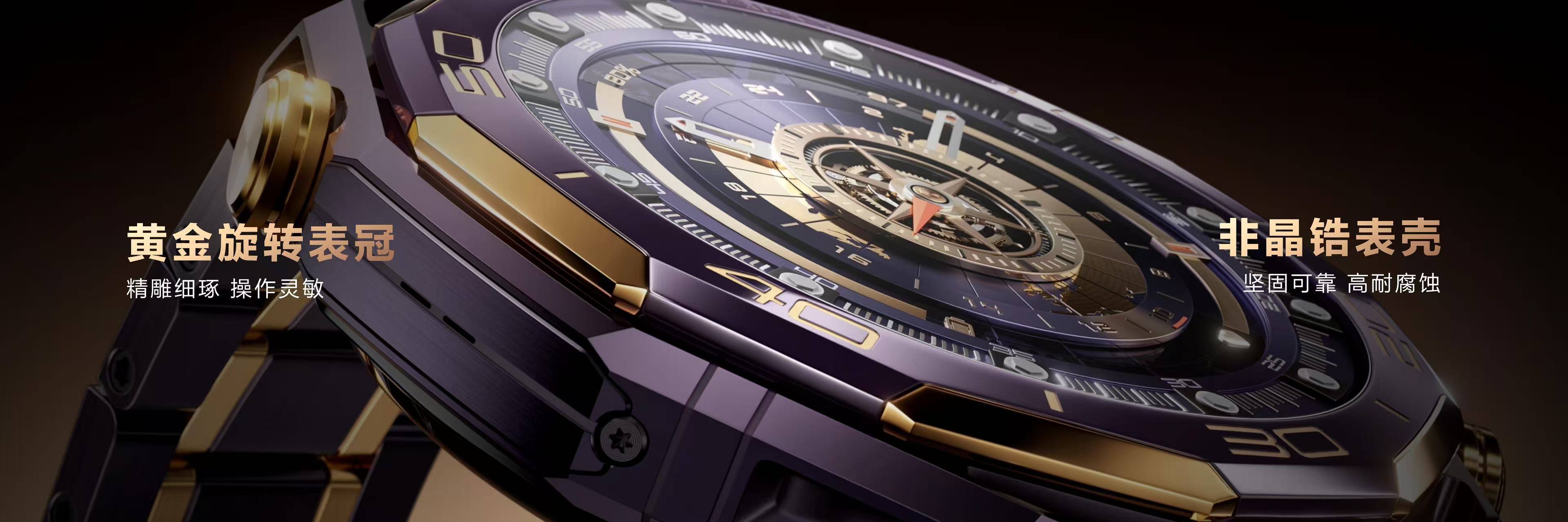 新一代华为非凡大师紫金款手表,整机手工镶嵌10段18K黄金,黄金旋转表冠,搭配业界首创复合稀土紫色陶瓷表圈,呈现低调奢华的紫金配色,加以钛合金紫色间金表带和蓝宝石玻璃表镜,高端材质砺就非凡基底。华为紫金表,腕上紫气金来!华为紫金表展现了低调奢华的尊贵气质,融合了时代尖端科技,既是功能强大的智能设备,也是彰显身份的腕间名片。