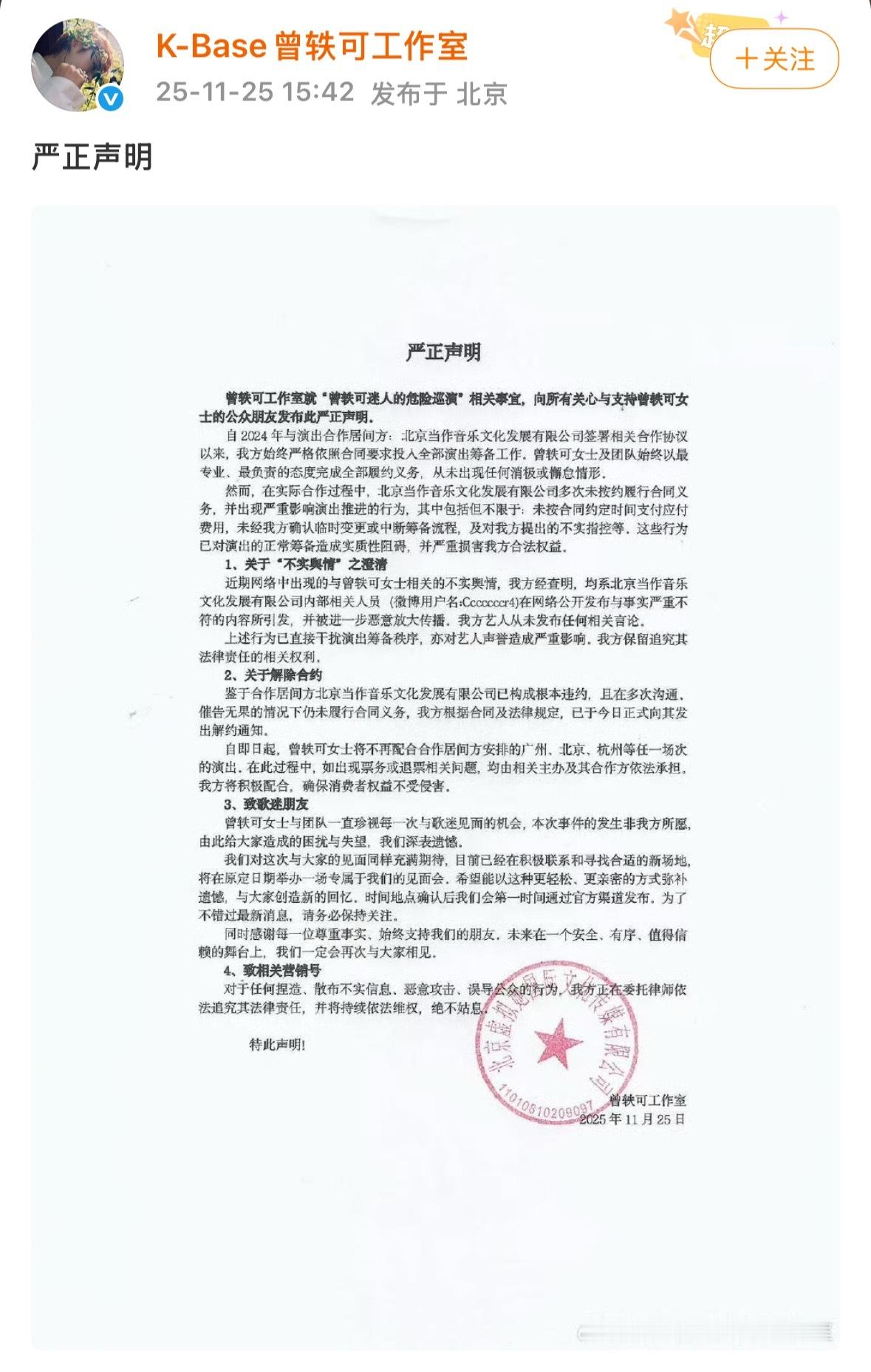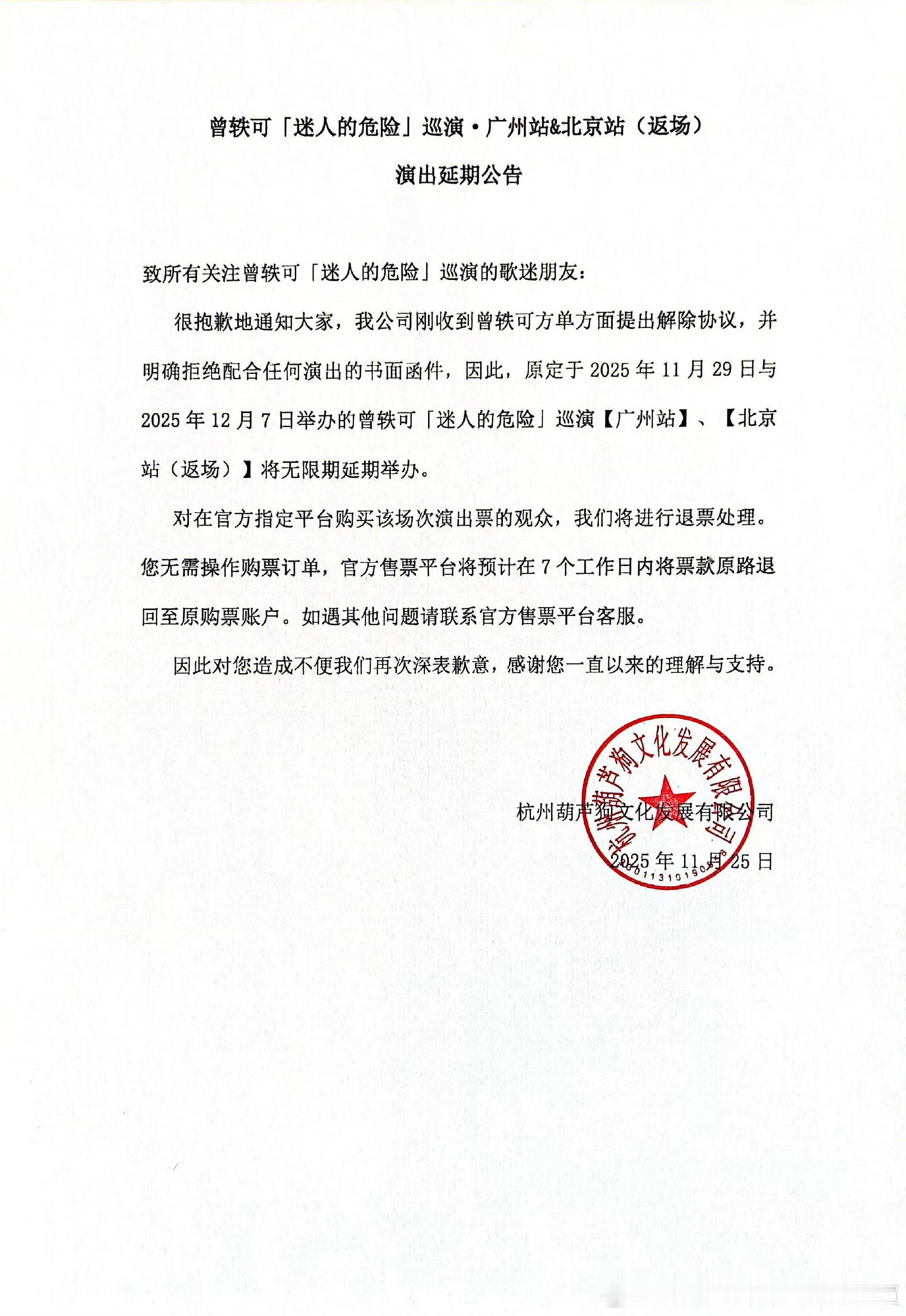 巡演主办方发文称曾轶可方单方面解约并拒绝配合演出,原定于2025年11月底的广州、北京站“迷人的危险”巡演将无限期延期曾轶可工作室也发文回应了,因合作方“北京当作音乐文化发展有限公司”严重违约,已正式解除合约,原定巡演取消,并将依法追究其责任。