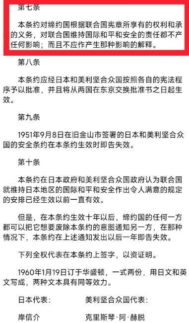 “敌国条款”已失效?《美日安保条约》早为中国攻日留好后门! 为了给高市的言论洗白,日本外务省也开始公然造谣了,竟用官方账号宣称“敌国条款”已经失效,还指责中方错误引用联合国条款。 说白了,日本外务省这波操作简直是把 “睁眼说瞎话” 玩到了新高度,为了给高市那不靠谱的言论擦屁股,居然敢用官方账号造谣说 “敌国条款” 已经失效,还倒打一耙指责中方错误引用联合国条款。 但可别光顾着嘴硬,真要较起真来,谁拳头硬谁才有话语权,那些花里胡哨的话术到最后全是白费功夫,毕竟在铁锤面前,钉子就算再硬也得乖乖弯腰。 大家都看得明白,真要是打起来,美国绝对不会傻乎乎地掺和进来,现在国际局势明摆着,俄罗斯那边盯着欧洲呢,美国要是敢在亚洲动手,那不就等于同时跟中俄两个大国对上了? 就美国现在那实力,别说两线作战了,就算在一条线上想占到便宜都难,而且美国对日本的心思,明眼人都看得透,表面上拉着日本当盟友,实际上防日本防得比谁都严,这可是美国多少年的既定国策了。 早几年我就看过一篇分析文章,里面说得特别透彻,美国在亚洲真正把当成对手的,其实就是日本和中国这两个国家,想想也合理,日本当年的野心全世界都知道,美国怎么可能真的放心日本? 再说说当年蒋介石做的那事,简直能气死人,几百万日本兵啊,就那么毫发无损地送回日本了,一点惩罚都没有。 你说这后果有多严重?现在日本有些人还在那美化侵略历史,不就是因为当年没受到应有的教训吗?蒋介石这一举动,说是民族罪人一点都不为过,给后来留下了多少麻烦。 现在日本外务省还敢出来造谣 “敌国条款” 失效,真以为大家都忘了历史,忘了美国对它的提防,忘了中国的实力了? 前段时间还有消息说,美国跟日本签的《美日安保条约》里,其实早就留了后门,表面上是说保护日本,可真要是中国和日本发生冲突,那条约里的条款根本就没法让美国必须出兵帮忙。 美国心里门儿清,真要跟中国动手,损失可不是一点点,它才不会为了日本去冒这个险,而且日本自己也清楚,美国靠不住,可又不敢明着跟美国掰扯,只能在旁边煽风点火,想把水搅浑,可这种小伎俩根本没用。 现在国际上谁不明白,光靠嘴炮解决不了问题,真要有实力,不用多说别人也会敬畏,日本外务省这时候跳出来造谣,只会让人觉得它心虚,觉得它想掩盖什么,大家心里都有杆秤,谁对谁错,谁在说真话谁在撒谎,一眼就能看出来。 本文仅为个人对时事的解读与看法,不代表任何官方立场,大家对日本外务省的言论、《美日安保条约》以及相关历史事件有什么看法,欢迎在评论区一起讨论。