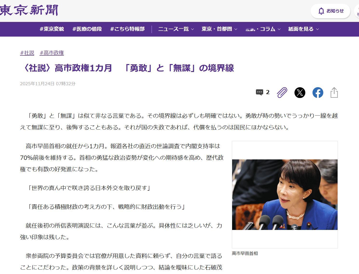 日本东京新闻写的很实在:高市在内外施政方面均未取得任何成果,仅仅是将整个日本推向战争危险的一个月。最后一句尤为精辟:"我们选民绝不能为首相的激进言论所蛊惑,必须仔细审视政策的实质内容。"(安倍)执政一个月来内政外交毫无建树,反倒将整个日本推向战争危险边缘。