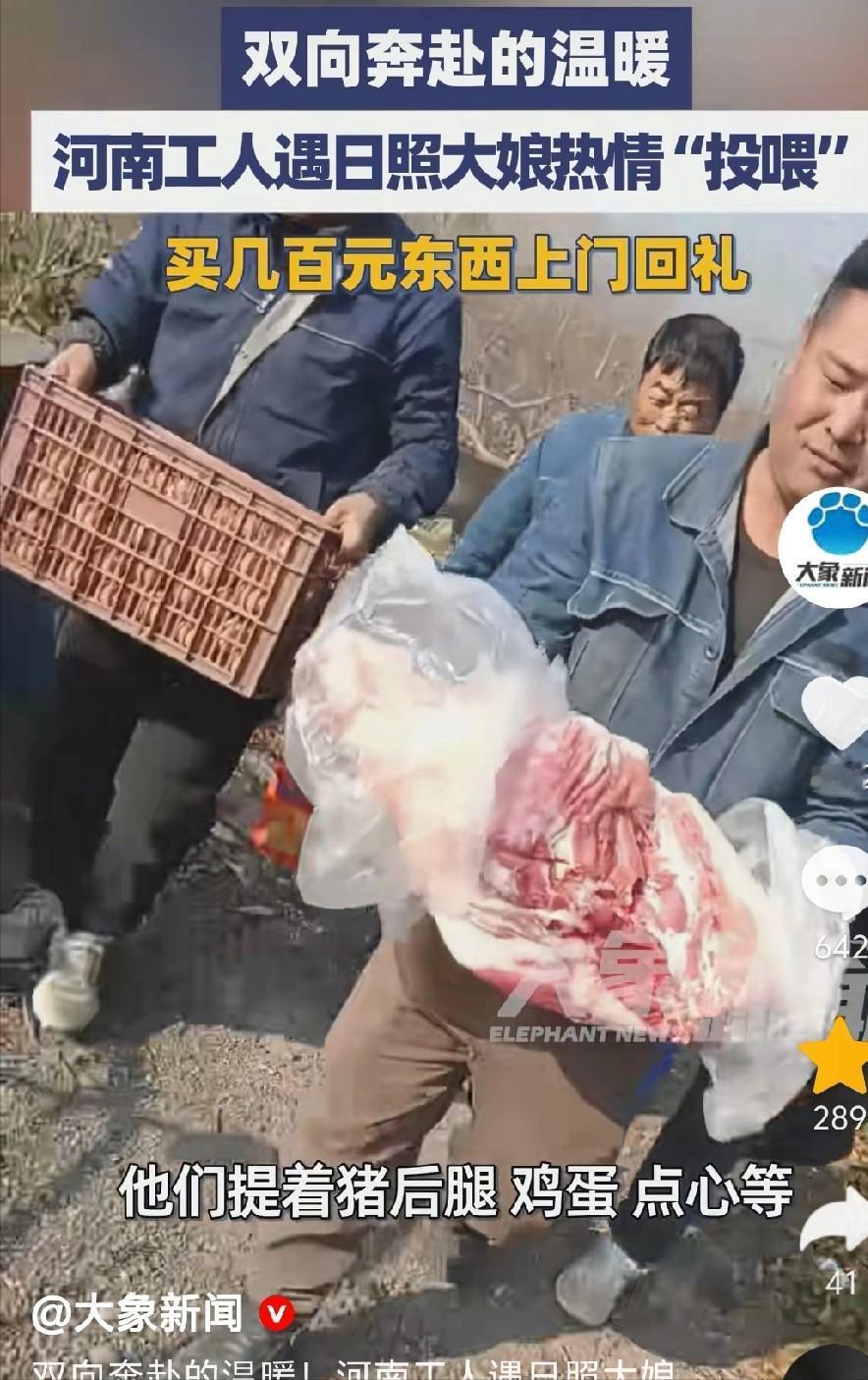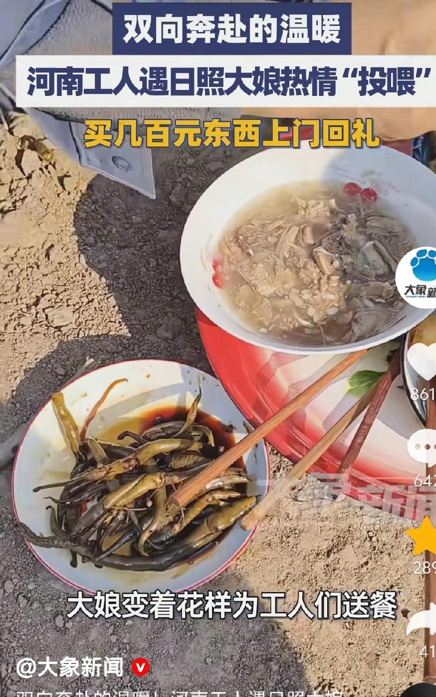 11月8日山东日照,一名河南小伙子和工友们来日照架高压线,因为口渴向本地一位大妈讨水喝。大妈一看这群浑身是土的工人,年纪跟自家孩子差不多大,还大老远跑来干活,心疼得不行。 2025 年河南工人王全保寄来的胡辣汤料,摆在卢桂花家灶台上。她刚给工人寄去新炒的日照绿茶,快递单还没来得及收。 这场始于讨水的缘分,早成了跨省的 “亲戚往来”。 11 月的一个傍晚,卢桂花收拾厨房时。 瞥见窗台上的暖水瓶,突然想起那群河南工人。 四天前,他们敲开家门讨水的模样,还清晰在眼前。 “灰头土脸的,衣服上全是泥,看着就心疼。” 她跟邻居念叨。 时间倒回 11 月 8 号午后,后逊峰村的荒坡上。 王全保和工友们架完一段高压线,坐在地上喘气。 随身的凉水壶空了,太阳晒得人头晕,远处连个商店影都没有。 “去前面那户人家问问吧,不然真要渴晕了。” 工友提议。 一群人磨磨蹭蹭走到卢桂花家门口,手都没敢用力敲。 门开的瞬间,卢桂花的第一句话让他们愣了:“渴坏了吧?”没等他们解释,她转身就往厨房跑:“凉水喝不得,我给你们泡热茶!” 王全保后来总说:“那声关心,比热茶还暖人。” 第二天清早,卢桂花五点就起了床。 在灶台前蒸红薯、煮芋头,还炒了盘虾皮小菜。 她把吃食装进竹篮,往工地走时,天刚蒙蒙亮。 工人们看见她,都从脚手架上往下爬:“姨,您怎么来了!”接下来的几天,卢桂花的竹篮成了工地上的 “惊喜”。 今天是白菜粉条炖肉,油花飘在汤上;明天是刚炒的青菜,还带着露水。 最让工人们没想到的是,她竟端来了油炸知了猴。 有个年轻工友从没见过,不敢下嘴,王全保先尝了一口。 “香!跟俺们河南的炸金蝉一个味!” 他边吃边说。 卢桂花看着他们狼吞虎咽的样子,悄悄回了家,又炒了一盘送来。 转场前一天,王全保带着工友去帮卢桂花修家电。她家的洗衣机坏了好久,一直没舍得修。 工人里有懂维修的,拆开一看,是零件松了。很快修好后,王全保还教她怎么保养:“姨,以后坏了就给俺打电话。” 王全保偷偷跟工友商量:“咱们得给姨买点东西,不能白吃她的。” 凑钱买的水果牛奶,却被卢桂花硬推了回来。 11 月 13 号,队伍要转场去邻村。 王全保特意早起,带着几个工友绕路去卢桂花家。 这次他们扛着猪后腿,还提了鸡蛋和糕点。 “姨,您天天给俺们送饭,这点东西您一定收下!” 王全保把东西往屋里搬。 卢桂花急得直摆手:“你们挣钱不容易,花这钱干啥!” “姨,这不是钱的事,是俺们的心意!” 王全保坚持。 看着这群实在的小伙子,卢桂花没再拒绝,眼眶却红了。 “以后路过,一定要来家里吃饭。” 她送他们到村口。 转场后的第一个周末,王全保给卢桂花打了电话。“姨,俺们在这边一切都好,您放心。” 电话里,卢桂花反复叮嘱他们注意安全,按时吃饭。 挂了电话,王全保把通话记录存好,备注是 “日照姨”。 这段故事被工友拍成视频传到网上后。 评论区里满是感动,有人说 “好客山东名不虚传”。 卢桂花看到视频,笑着说:“我就是做了点小事,没想到这么多人知道。” 如今,卢桂花还是会经常去工地那边转转。 看看架好的高压线,就想起那群小伙子干活的模样。 王全保他们也没断了联系,逢年过节就给她打电话。 有时还会寄点河南的特产,像走亲戚一样。 卢桂花的灶台,依旧会时常炖起白菜粉条。 每次做,她都会多做一份,好像那群工人还在身边。 王全保的手机里,存着越来越多和卢桂花的聊天记录。 那些文字里,满是跨越地域的牵挂,比高压线更紧密。 在这个快节奏的时代,这份普通人之间的善意。 像冬日里的暖阳,融化了陌生人之间的隔阂。 它告诉我们,善意从来不是单方面的付出。而是你对我好,我对你更好的双向奔赴,是陌生人之间最珍贵的缘分。 现在,后逊峰村的高压线上,电流稳稳流淌。 就像卢桂花和河南工人之间的情感,从未中断。 这份温暖,会一直留在他们心里,也留在每个听说这个故事的人心里。 信息来源:齐鲁网《河南工人被山东大娘热情“投喂”》(2025-11-18)