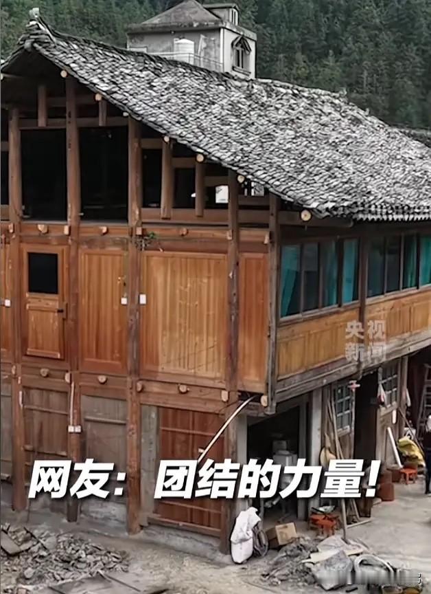 “开眼界了!”贵州榕江县平寨村,一位村民想要将老房子抬到一边,在原地盖新房,于是200多名村民集体合作,将一栋2万多斤的传统木楼整体平移30余米,顺利完成了这场“硬核”搬家,整个过程都未使用机械。网友:团结就是力量! 村民罗德美是这栋两层木楼的主人,房子建成二十多年了,杉木结构,重达近两万斤。随着家里三个孩子渐渐长大,老房子显得格外拥挤。他盘算着把木楼挪开,在原址上建一栋更宽敞的砖混结构新房,这样既改善了居住条件,老木楼也能继续发挥作用。 搬家定在11月5日,消息原本只传了几个人,结果一呼百应,当天一下子来了二百多位乡亲。大家分工明确,年纪大的在下面稳稳接住从屋顶传下的瓦片,年轻的则负责爬上爬下,小心地把瓦片一片片揭下,再整齐码放好。有经验的老师傅们则在房子四周麻利地绑上加固的棍子和绳子,防止木楼在移动时变形。 扛楼开始后,村民用粗木杠穿过底座,众人肩扛手抬,一开始用力不齐,试了几次,房子纹丝不动。这时,村里的年轻人石庆喜喊起了号子,“一、二、三!”的节奏一起,在整齐的号子声中,这座房子一寸一寸地开始了移动。四十多分钟后,木楼被精准地平移了30多米。整个过程中,连一块玻璃都没碎。 这种在黔东南地区常见的干阑式建筑,采用穿斗式木构体系,全靠榫卯连接。整个房子就像一套积木,有很好的韧性和稳定性,这才能人力搬运成功,这种搬家方式,背后可藏着老祖宗留下的智慧。 这场搬家没有用到重型机械,也没有人计较报酬,全凭乡里乡亲那份深厚的情谊。为表达谢意,罗德美一家在当天下午摆了二十多桌“答谢宴”,热热闹闹的场面,吃的是一份浓浓的乡土人情。平寨村的村支书说得实在:“我们这儿一方有需要,八方支援。”这种根植于乡土社会的互助精神,比任何机械的力量都更温暖,也更坚韧。 各位读者你们怎么看?欢迎在评论区讨论。