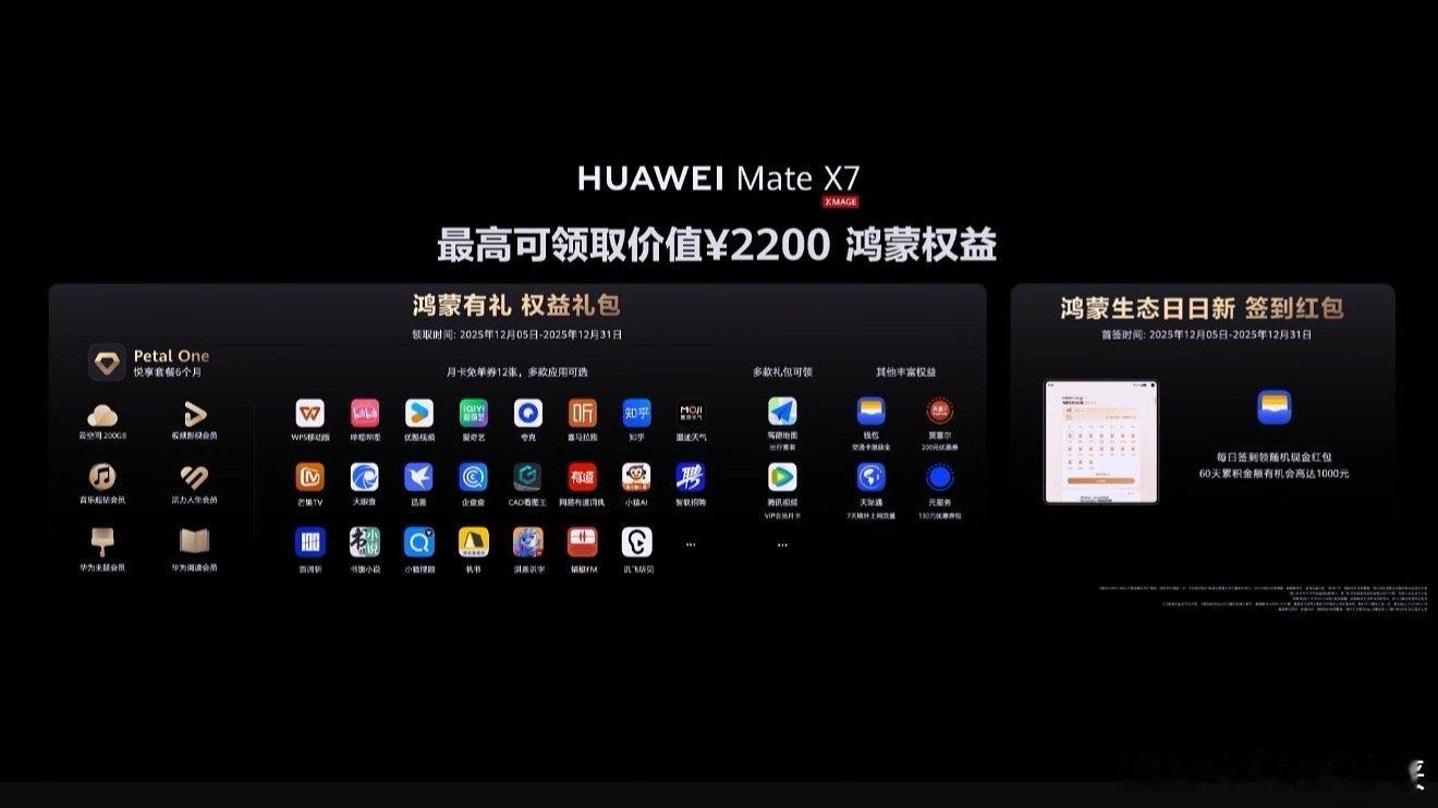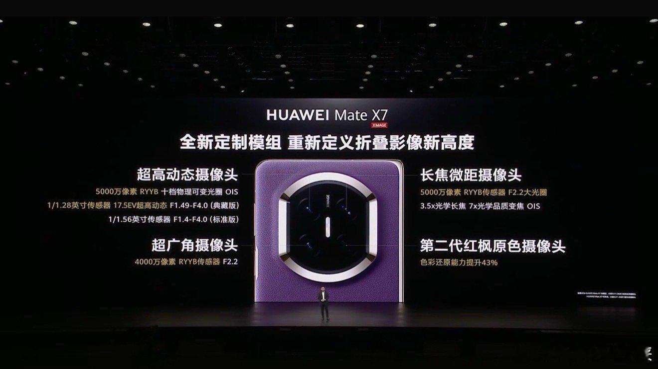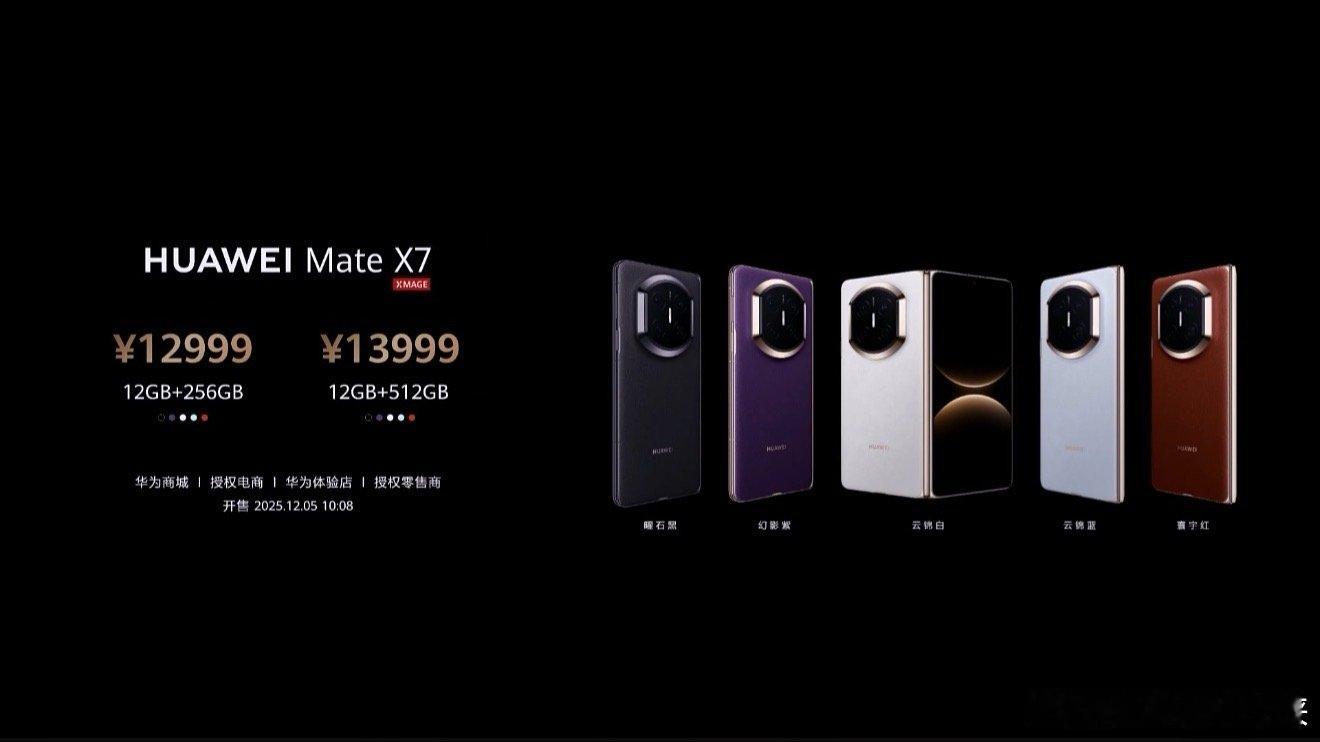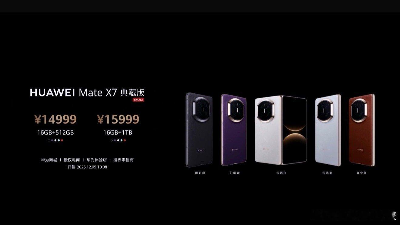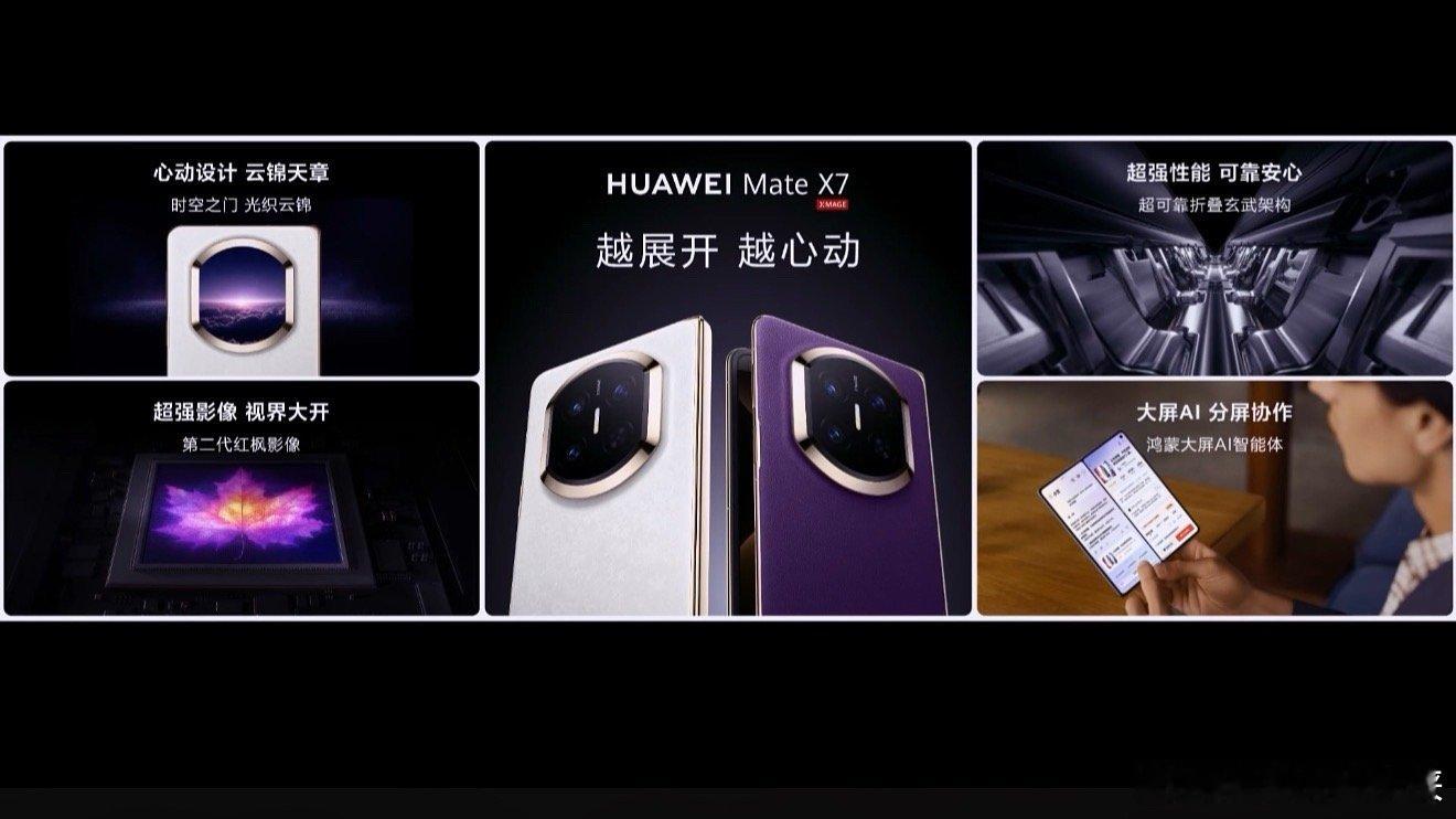 余承东在直接把折叠屏拉到新高度了,Mate X7有云锦蓝和云锦白的非遗工艺配色,还有曜石黑、寰宇红、幻影紫共5色可选择。后摄是新星钻几何的设计,素皮/锦纤/玻璃后盖任意选择,221g加4.6mm超薄机身,单手握持完全不压手。外屏90Hz刷新率日常用是很顺的,内屏1-120Hz LTPO可以自适应调光,这样其实会更省电。还支持3D人脸识别+侧边指纹双解锁。鸿蒙6能开6个悬浮窗,星闪连接传文件超5Gbps,和电脑协同延迟才5毫秒,办公党可以狂喜了。还有5500mAh双电芯电池+50W无线充,续航拉满。余承东还宣布MateX7在配置全面升级的情况下价格不变,实现了加量不加价 性价比一下子拉满了。