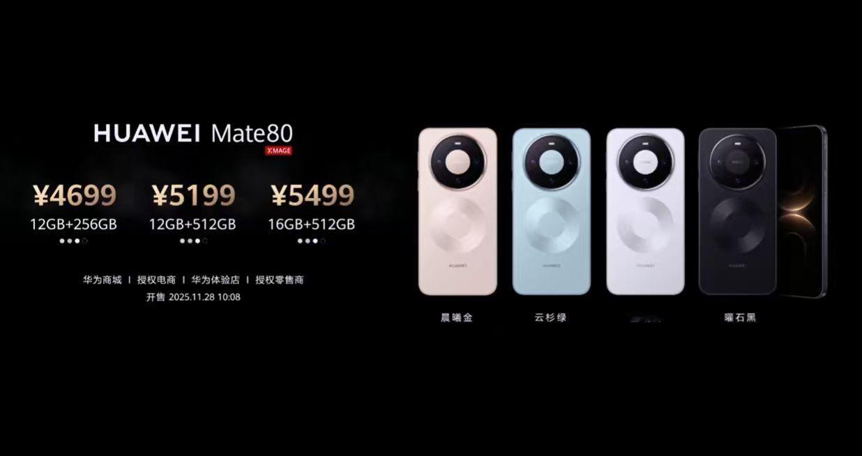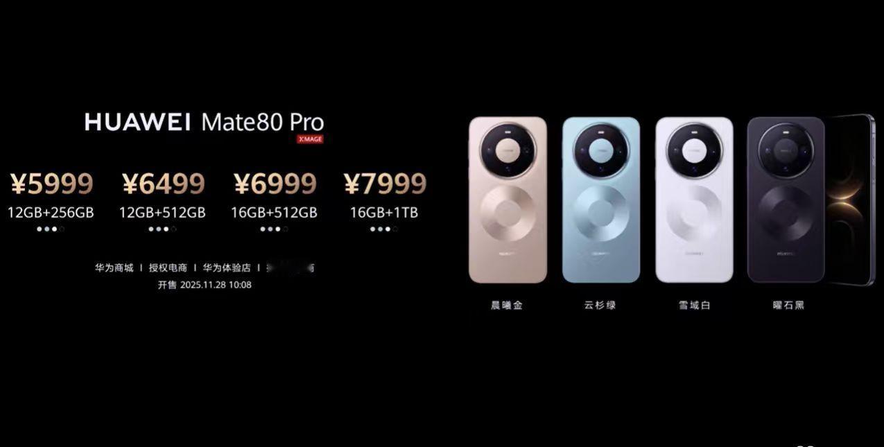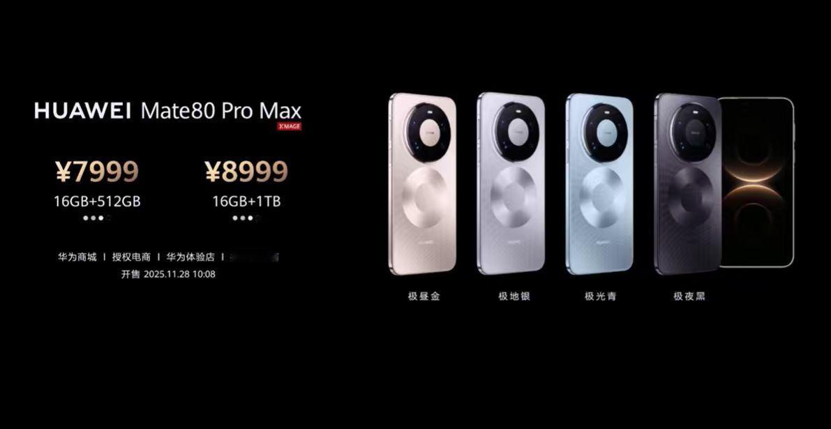 举行。全新的 Mate 80 及 Mate 80 Pro 系列价格来了!首发搭载 HarmonyOS 6 操作系统,价格如下:HUAWEI Mate 8012GB+256GB 版本:4699 元12GB+512GB 版本:5199 元16GB+512GB 版本:5499 元HUAWEI Mate 80 Pro12GB+256GB 版本:5999 元12GB+512GB 版本:6499 元16GB+512GB 版本:6999 元16GB+1TB 版本:7999 元HUAWEI Mate 80 Pro Max16GB+512GB 版本:7999 元16GB+1TB 版本:8999 元