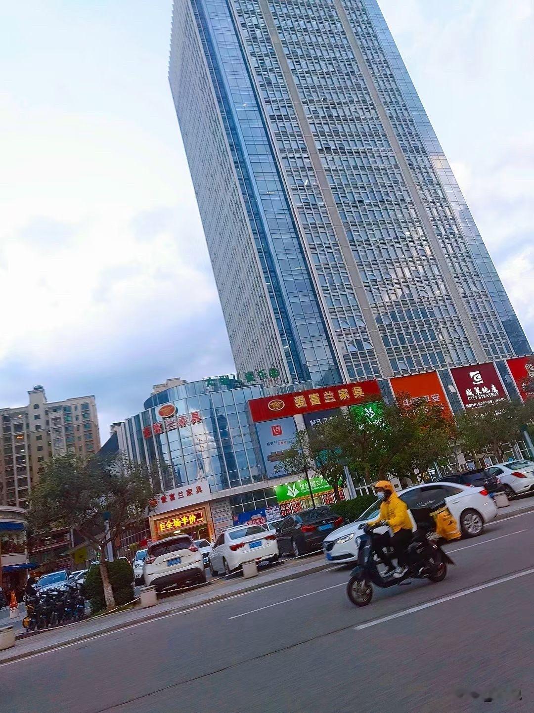 抬头瞅见这栋玻璃高楼,直戳戳杵在天边上,反光晃得人眼晕。楼底下商铺挤得满,“爱普兰家具”的红招牌特扎眼,还有个“全场半价”的黄灯箱亮着。 马路上小黄衣骑手拧着电驴窜过去,风都带起来了。路边停的车挨挨挤挤,树叶子蔫蔫的,天儿有点灰蒙蒙——这就是城市里最常见的下午,又忙又燥,可烟火气也裹在里头。