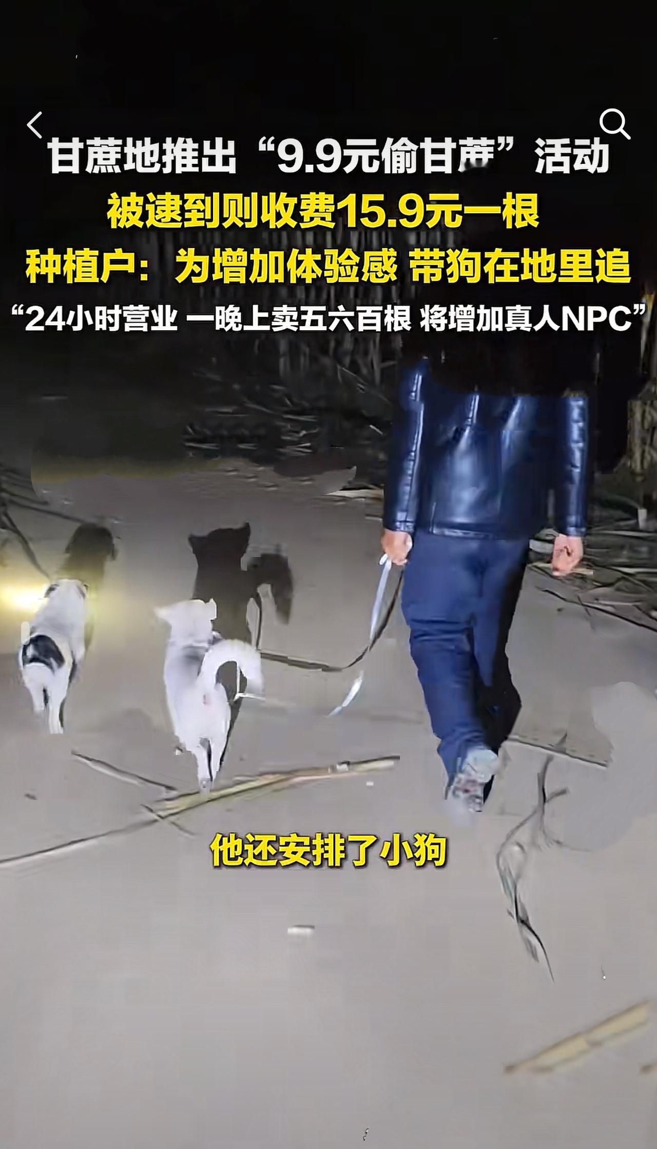 甘蔗地深夜狂欢!9.9元偷甘蔗,是趣味还是糟蹋? 花9块9去偷甘蔗,你说这是智商税还是真会玩?最近四川眉山的“偷甘蔗”体验火出圈,网友吵翻了天,我也忍不住去凑了回热闹。 事情是这样的,当地种植户童鹏飞两口子在自家甘蔗地搞了个自助体验区,9.9元就能进地“偷”甘蔗,24小时营业。一开始大家都当玩笑,结果视频一发,评论区炸了:“没狗撵不刺激!”童哥立马回怼:“狗已就位,只能偷甘蔗不能偷狗儿!”这波互动直接把气氛拉满。 真正爆火是童哥拍了条打手电追人的视频,黑灯瞎火的甘蔗地里,一群人抱头鼠窜,NPC大爷带着小狗满场乱窜,画面又野又欢乐。我到现场一看,好家伙,人山人海,手电光晃得像电音节现场。规则很简单,砍了甘蔗带出地头就算“偷”成功,被抓到就得表演才艺。有人被狗追得摔进田埂,还得现场唱《孤勇者》,全场笑到打鸣。 但热闹背后也有烦恼。童哥最近愁得睡不着,有人砍了甘蔗直接扔,还有人蹲地里啃,农民血汗钱打了水漂。他发视频苦笑:“狗都累趴了,真扛不住了!”现在加了2.99元入场费,还求大家别来凑热闹,结果网友反手就是一波反向安利:“老板说不好玩?必须冲!” 说到底,这9.9元买的不是甘蔗,是放下手机、钻进田里疯跑的快乐。有网友说:“不是甘蔗便宜,是快乐难得。”你咋看?