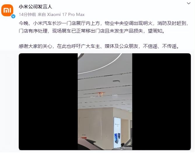 长沙一小米汽车门店展厅起火 商场回应:中央空调管道温度过高导致起火 11月20日晚,多位网友在社交平台发布视频,反应湖南省长沙市步步高梅溪新天地商场的一家小米汽车门店发生火灾。 视频显示,小米汽车门店内部烟雾缭绕,已有消防部门工作人员在现场进行扑救。 11月20日晚,小米公司发言人发文称:今晚,小米汽车长沙一门店展厅内上方,物业中央空调出现明火,消防及时赶到,门店有序处理,现场展车已正常移出门店且未发生产品损失。 点个关注吧!汽节车社,车圈热点资讯每日一扫清!【来自懂车帝车友圈】