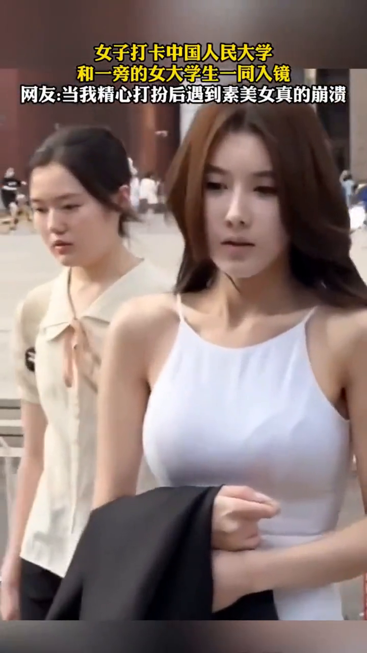 女子打卡中国人民大学,和一旁的女大学生一同入镜。 网友:当我精心打扮后遇到素美女真的崩溃。好好看。