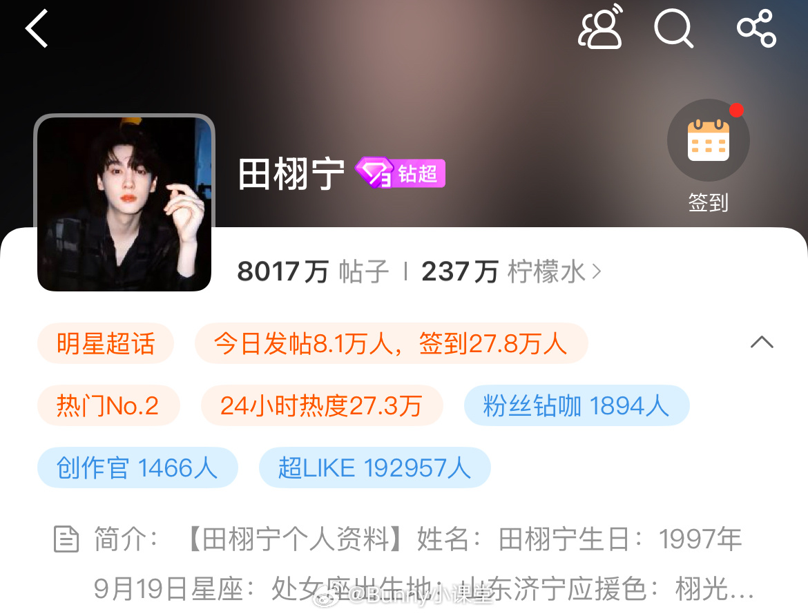 田栩宁超话帖子突破8000万,超like近20万,这才是真顶流吧