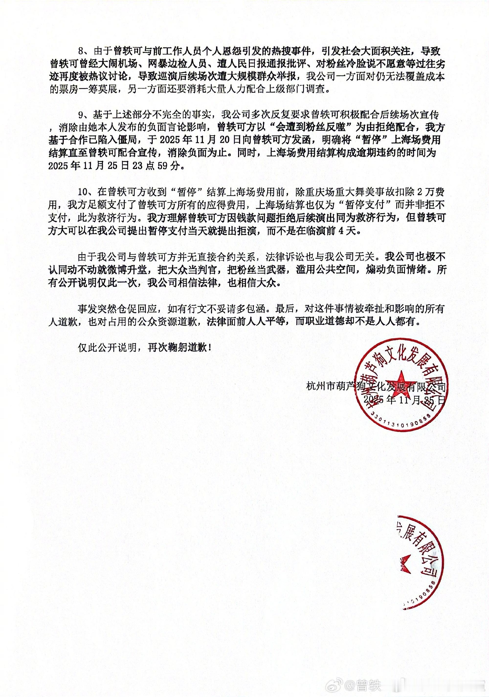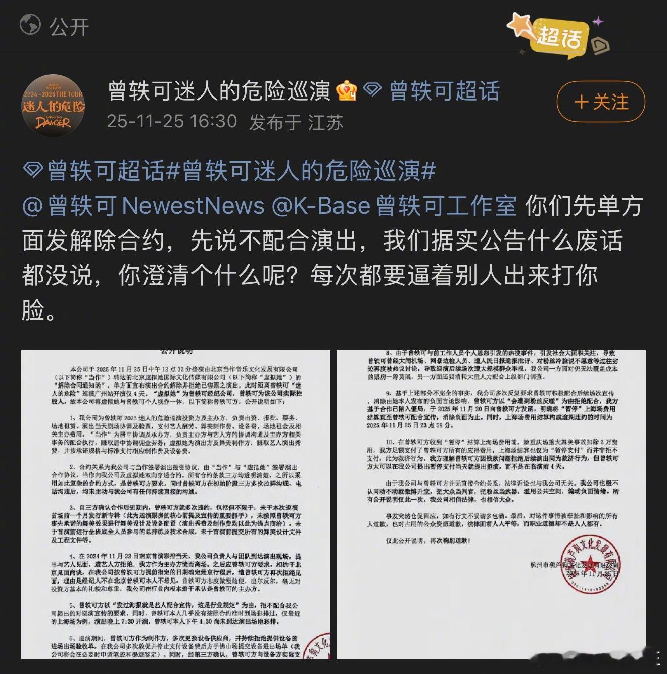 主办方再度喊话曾轶可,放话“职业道德不是人人都有”,并公开列出了曾轶可的10条相关说明,包括确认合作后曾轶可方多次违约,拒绝与巡演方工作人员见面,不配合宣传,多次更换设备供应商等,以及曾轶可当初大闹机场、网暴边检人员等事件再次发酵后,以至于后续巡演场次被举报等等。