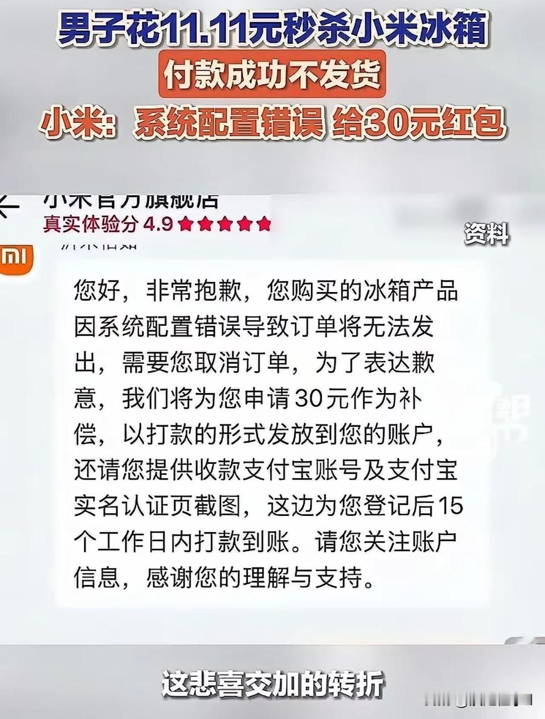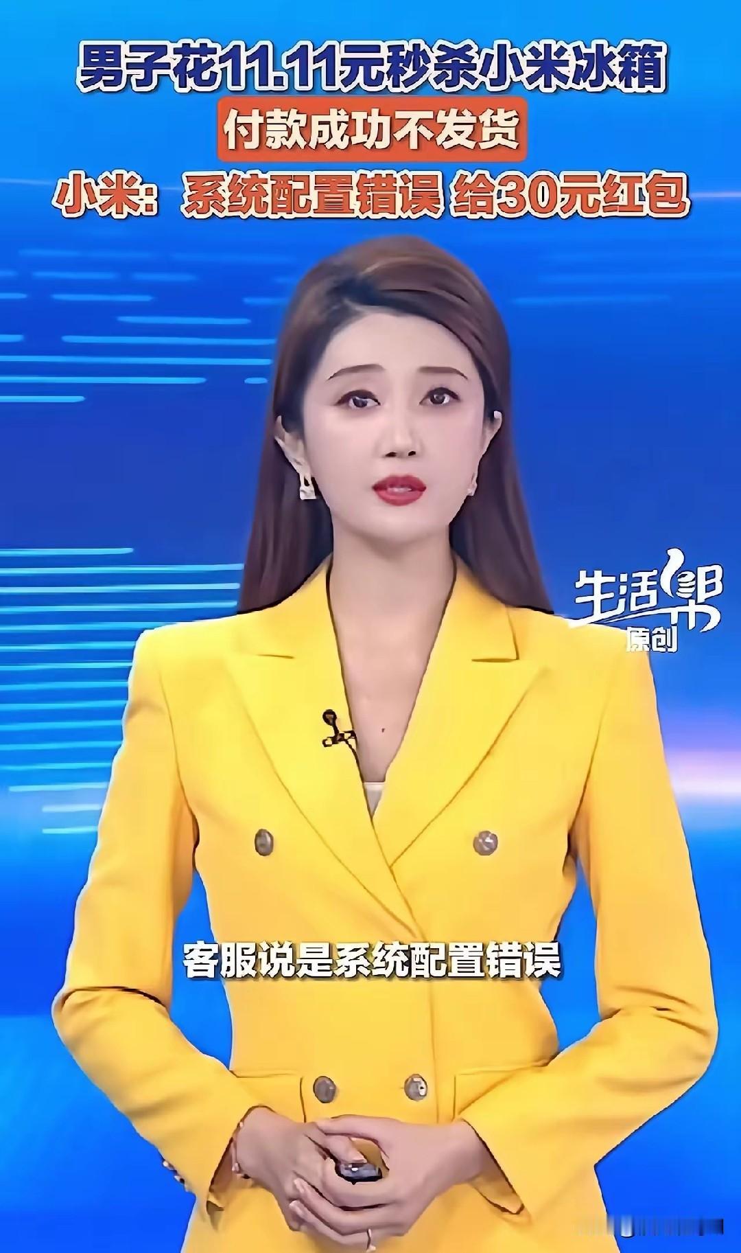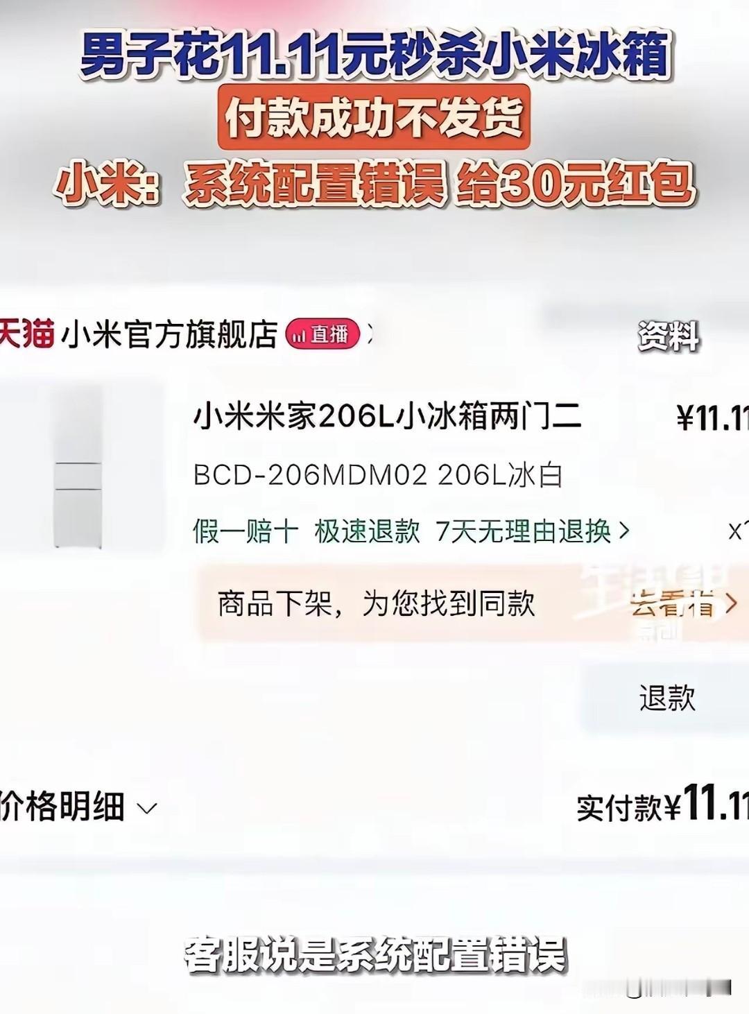 晒图笔记大赛河南男子11.11元秒杀小米冰箱付款成功,商家以系统配置错误拒发货仅赔30元引其炸毛。双十一当天张先生紧盯倒计时下单,支付成功后满心欢喜,不料客服告知价格设置失误无法发货,提议取消订单补偿30元红包,张先生怒斥这是打发叫花子,称活动标注秒杀成功即发货,商家纯属玩不起。他向平台投诉,平台核查后表示可处罚商家,却称订单金额低商家或拒发货,还建议他接受补偿省麻烦,这般和稀泥态度让其寒心。事件曝光后网友热议,有人吐槽商家吸流量后毁约,也有人觉得商家失信誉得不偿失,商家此举本质是拿消费者当流量工具,毁约式促销如同“狼来了”消耗行业信任,践踏契约精神。预估后续张先生或维权到底,行业或因这类行为加剧信任危机,后续商家是否会履约止损挽回口碑,来聊聊!