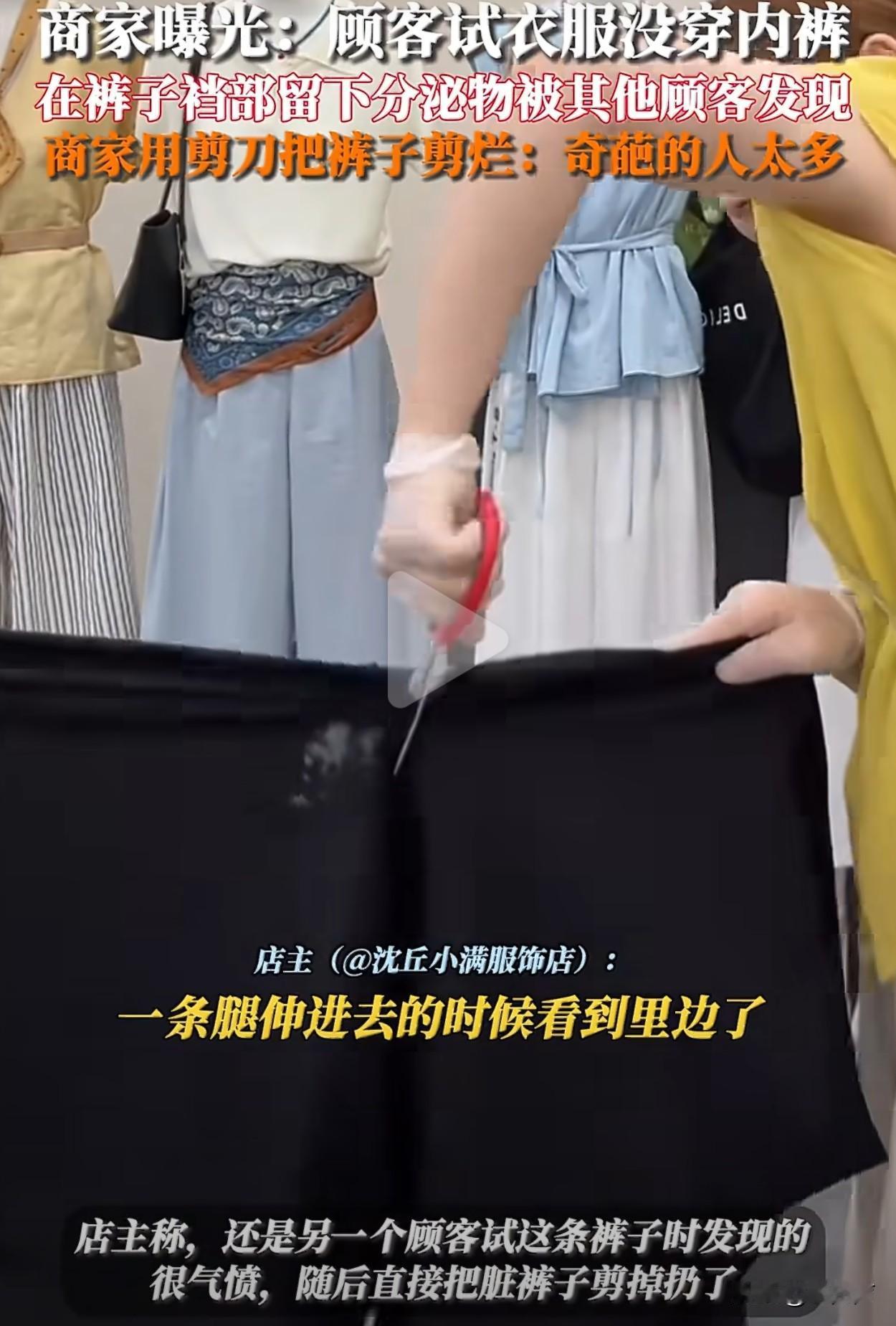 今天刷到个视频真给我整无语了!一服装店,顾客试穿裤子没穿内裤,结果裆部留下分泌物,被下一位顾客当场抓包!商家气得直接拿剪刀把裤子剪烂,怒吼“奇葩的人太多”!监控里那试衣的姐们儿一脸淡定,毫无尴尬,可店家说这都不是头一回了。 想起来之前还有更离谱的!安徽有女子试穿包臀裙没穿内裤,第二天居然要求退货,被拒后还反骂店家;还有人在优衣库试衣间弄脏衣服死不承认,甚至理直气壮溜走。现在商家们被逼得没办法,有的准备一次性内裤,有的加强消毒,生怕再踩雷区。 这事儿简直离谱到家!试衣服不穿内裤,是把试衣间当公共厕所吗?分泌物残留恶心不说,万一传染疾病怎么办?下一位顾客不知情穿上,风险谁担?商家剪裤子解气是解气了,但合法吗?网友吵翻了天,有人支持“以暴制暴”,有人觉得过度反应。但说句大实话,试衣是权利,卫生是底线啊!顾客图省事,把麻烦全甩给商家和他人,这自私行为还不该骂?