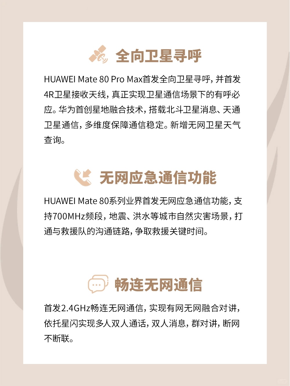 说个实用的,如果你经常自驾去偏远地区,一定要了解华为Mate系列的卫星通信。之前有人就是用华为Mate 系列的北斗卫星消息获救的。如今,华为Mate 80带来了全新的无网应急通信技术。它能在完全没信号的情况下,通过700MHz频段实现13公里通信覆盖,信号还能穿透三层楼。加上2.4GHz畅连和星闪技术,真正实现断网不断联。这个设计特别适合中国复杂的地形环境,建议户外爱好者都关注下华为Mate 80。