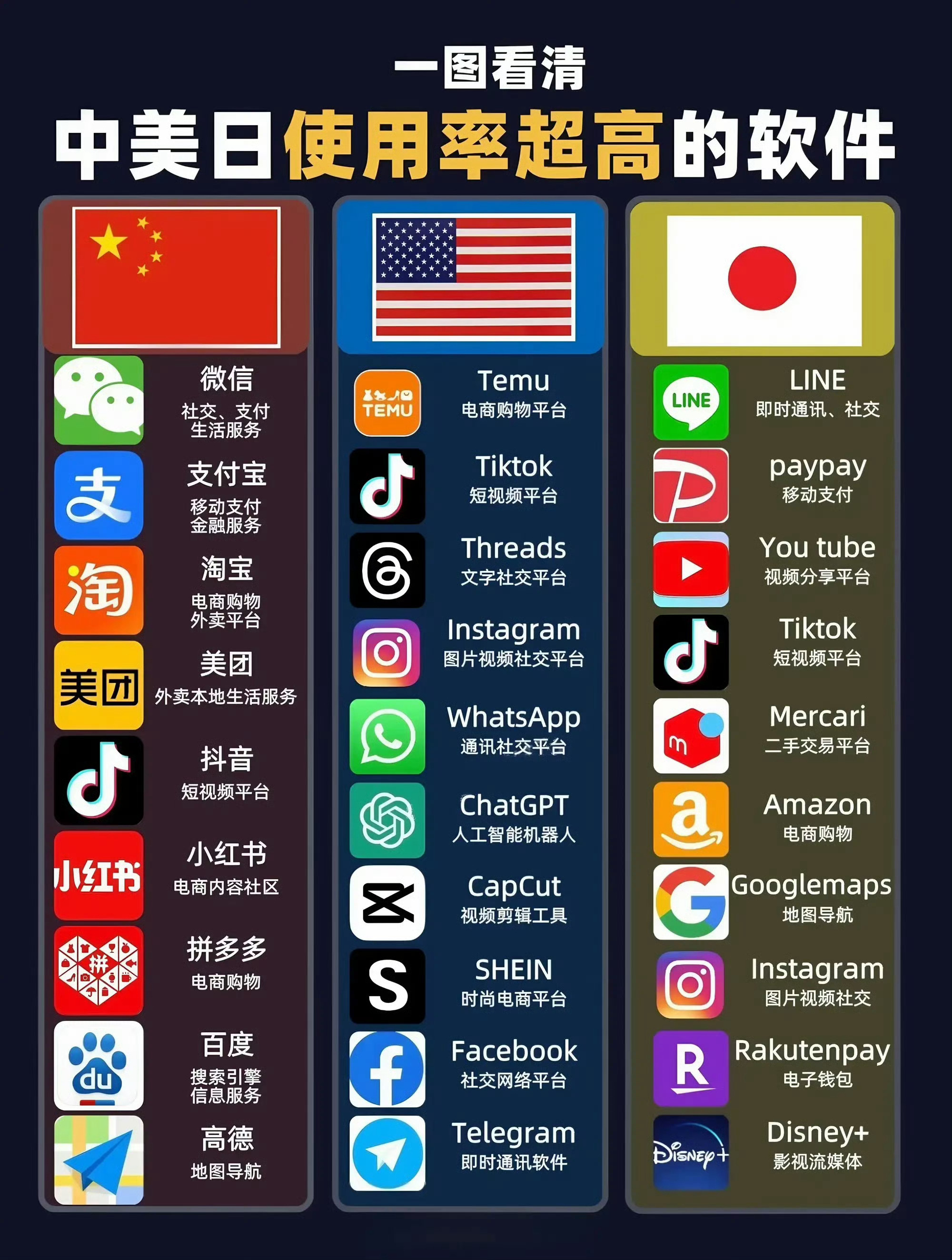 中日美人群常用的app