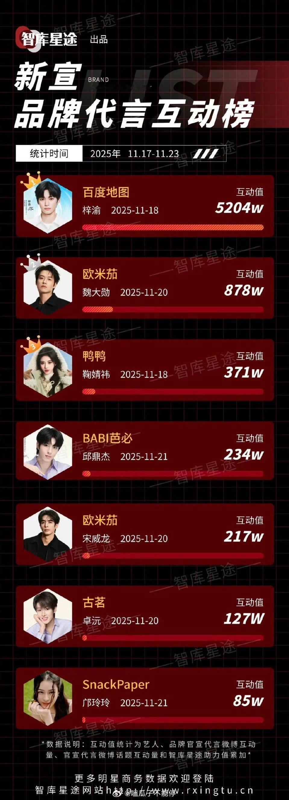 上周新宣品牌代言互动榜梓渝魏大勋鞠婧祎邱鼎杰宋威龙卓沅邝玲玲