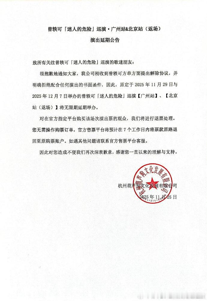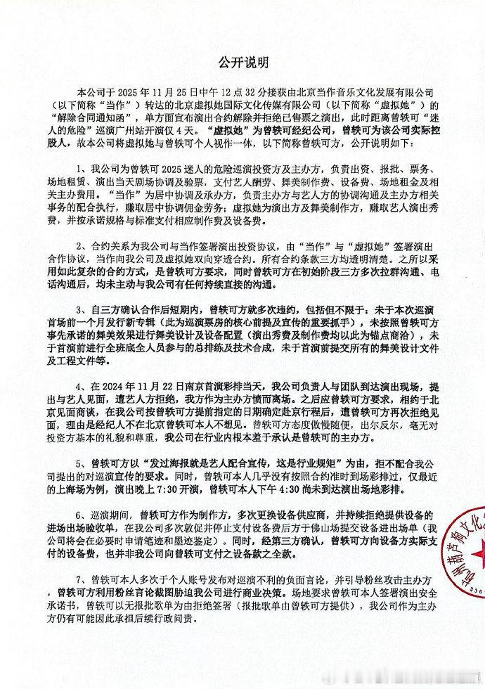 曾轶可和演唱会主办方撕起来了主办方表示曾轶可方单方面解除合约不配合演出还颠倒黑白。真不知道是什么人在喜欢她?之前不配合安检还把边检民警个人信息发网上引导网暴,19年被蓝底白字点名过了,没想到这么多年还是完全没变啊