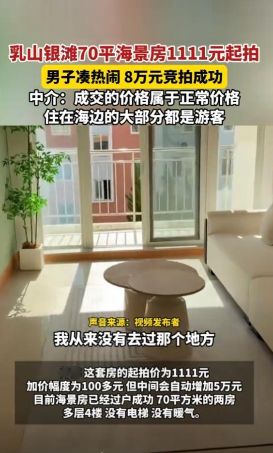 [太阳]天上掉馅儿饼?一女子老公花8万元在网上拍得一套70平米的海景房,房子位于乳山,女子开车900公里去乳山看房,发现已经20年的房子保持得还比较干净,房子在4楼,没暖气没电梯,但楼下就是海,海鲜又便宜又新鲜!   据南阳日报11月24日报道,那天,男子在家中刷手机时,意外看到一条拍卖信息,吸引了他的注意:一套起拍仅需千元的海景房,背靠威海银滩。      对他而言,这或许是一次改变生活的机会,他试探性地跟妻子商量了一下。   两人对未来能拥有一处“面朝大海,春暖花开”的度假之家充满憧憬,随即决定试着参与竞拍。    拍卖的过程并没有想象中那么轻松,数字在屏幕上快速跳动,竞争激烈,节奏急促得让人难以思考。   原本只想试水的夫妻,不知不觉中就陷入了价格战,眼看着一万二的保证金可能打水漂,他们咬咬牙不断加价,最终以七万多的总额“拍得”了这套20年房龄的海景房。加上税费及交易的相关费用,总金额达到八万四千多元。   但没等他们为“捡漏成功”高兴太久,网络上的评论让他们的热情逐渐冷却下来。   有人翻出了乳山房市的底细:当地的房源早已供过于求,80000元的成交价不仅谈不上“捡便宜”,还有可能是“接盘侠”的角色。   为了弄清这笔交易到底值不值,夫妻开了900多公里的车,花了十几个小时驱车来到乳山。   步上四楼,屋内的景象让两人暂时松了一口气。虽然2006年建成的房子已有不少年头,但内部保存得还算完好,地面和墙面干净整洁,家具虽然旧,但勉强可以使用。   而当他们沿着小区的小路步行几分钟,走到沙滩边时,这份海景房的“吸引力”被再一次放大。   该小区没有集中供暖设施,乳山的冬天既漫长又寒冷,气温可以低至零下十度,仅靠空调或电暖器取暖既耗电又难以避免潮湿寒气的侵袭。   长期暴露在海风中的建材容易老化,电器、管道等损耗更大,维护成本显然也是一笔开销。如果需要彻底舒适化地冬天居住,估计还要额外投入数万元进行改造。   这套房子看起来是“超值”的低价,但作为老区海景房的“鬼城属性”,市场整体供大于求,升值空间几乎为零。   附近类似的住房有人十年前花十几万买入,如今挂牌5万元,还少有买家问津。至于靠出租回本,也是难上加难。据了解,同区域精装修、拎包入住的优质小户型房子,房租每月最高也不过几百元,想回本几乎遥遥无期。 不过,这一对夫妻看得比较通透他们算过一笔账,对比每年数次旅游的花费,这样的投入还是划算的。   比起升值空间或长期回报,他们觉得只用把这套房子当成假期里的度假居所来看待。此前每次带家人去海边旅游,酒店的住宿费用算下来也是不小的开销,而这8万余元的投入,换来的是一个自有的“度假基地”。   在乳山,每年夏天大量外地人来此短期“候鸟式”度假,社区的入住率能达到六成以上,大家凑在一起拼车、逛市集、分享美食,相处自然热络。   即便到了冬天,小区的灯光变暗,人气下降,这种海边的小清净也有了别样的吸引力——寒冷与冷清的背后,是生活节奏的放缓与远离喧嚣。   这样的生活模式可能并不适合所有家庭,但在特定条件下,对于这对夫妻而言,拥有一套价格低廉、远离喧闹的度假屋还是一种实现生活理想的方式。   这套房子成为了他们退休后计划中一部分,除了作为一年数次的避暑居所,它更像是承载家庭情感和记忆的一隅。   每一次门窗打开,眼前的风景永远是海平线、浪头和漫长的沙滩。   对许多人来说,乳山的房屋不仅代表了低价海景房,更代表了人们对美好生活的追求,那些隐藏在价格背后的真正消费与感情投入,往往值得再三确认与思考。   信源:据南阳日报2025年11月24日报道——河南一男子花8万元拍下一套70平米海景房 海景房
