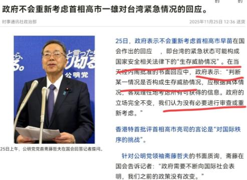 ·日本政府再次出来表态立场,嘴非常的硬!11月25日,根据日媒报道,日本政府声称,政府表示不会重新考虑首相高市早苗在国会作出的回应,即台湾的紧急状态可能构成国家安全相关法律下的“生存威胁情况”。在当天经内阁批准的书面回应中,日本政府表示:判断某一情况是否构成生存威胁情况,应根据具体情况,客观理性地考虑所有可获得的信息。 日本政府这番看似严谨的官方说辞,实际上就是在给高市早苗那番极其危险的言论打掩护,他们试图用“客观理性”这种字眼来包装一个极其主观且充满挑衅的政治判断,等于是在告诉全世界,高市早苗说的没错,政府就是这么想的。 紧接着,他们还特意强调,日本的立场完全没变,根本用不着审查或者重新考虑,这就等于把话给说死了,不仅不打算撤回之前的错误言论,反而还用整个内阁的决定,把这块铁板给钉得更牢了。 这起风波,就出在高市早苗在国会上的那番话。她当时公开把台湾地区的局势和日本的“生存威胁”直接挂钩,要知道,这个“生存威胁情况”是日本解禁集体自卫权、能够到海外动武的法律扳机。 高市早苗的言论,就是在试探把手放到这个扳机上,其背后的险恶用心和对我们底线的公然挑衅,已经是摆在桌面上的事了。 更值得玩味的是,日本政府选在这个时候发表这份强硬声明,恰好是在美日两国领导人通完电话之后,这很难不让人联想,是不是背后有人撑腰,才让他们有底气如此强硬。 在这样敏感的时刻,日本非但没有采取行动给局势降温,反而火上浇油,用官方文件把挑衅言论变成了“既定国策”,这无疑暴露了其真实的战略企图,也让地区和平的风险陡然升高。 面对日本这种一条道走到黑的架势,我们这边也把话说得非常明白了,高市早苗可以继续嘴硬,但有些规矩是碰不得的,我们已经明确划出了红线,道理也已经讲透。 如果日本方面仅仅停留在打嘴仗的层面,那不过是外交上的噪音。但如果他们胆敢把这些狂妄的言论付诸实际行动,哪怕是迈出试探性的一小步,那么等待他们的,必然是我们雷霆万钧的迎头痛击。 这无关情绪,而是维护国家主权和领土完整的必然选择,任何人都不要怀疑我们的决心和能力。
